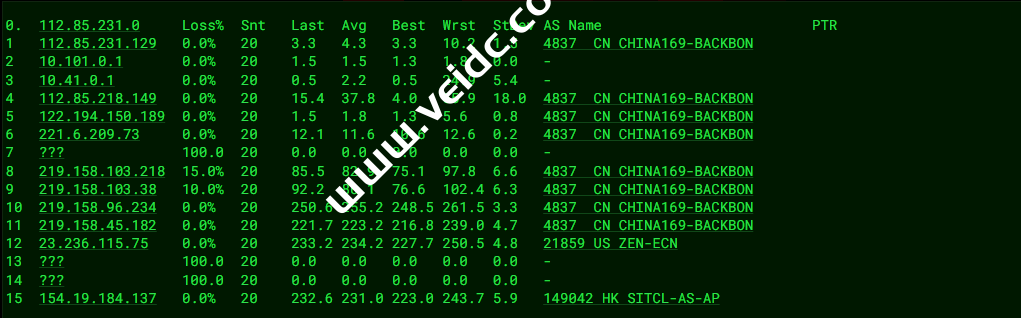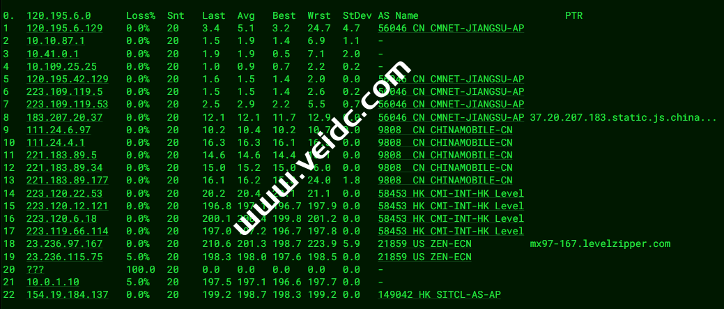 [Info] 测试路由 到 上海电信(天翼云) 中 ... traceroute to 101.227.255.45 (101.227.255.45), 30 hops max, 32 byte packets 1 _gateway (172.16.0.1) 0.30 ms * LAN Address 2 154.19.184.1 0.27 ms AS149042 United States, California, Los Angeles, cogentco.com 3 10.0.1.9 0.50 ms * LAN Address 4 10.0.1.3 0.64 ms * LAN Address 5 23.236.115.74 1.83 ms AS21859 United States, California, Los Angeles, zenlayer.com 6 218.30.53.133 7.59 ms AS4134 United States, California, Los Angeles, ChinaTelecom 7 202.97.43.53 130.31 ms AS4134 China, Shanghai, ChinaTelecom 8 * 9 * 10 * 11 * 12 * 13 * 14 * 15 * 16 * 17 * 18 * 19 * 20 * 21 * 22 * 23 * 24 * 25 * 26 * 27 * 28 * 29 * 30 * [Info] 测试路由 到 上海电信(天翼云) 完成 ! [Info] 测试路由 到 厦门电信CN2 中 ... traceroute to 117.28.254.129 (117.28.254.129), 30 hops max, 32 byte packets 1 _gateway (172.16.0.1) 0.42 ms * LAN Address 2 154.19.184.1 0.51 ms AS149042 United States, California, Los Angeles, cogentco.com 3 10.0.1.9 0.58 ms * LAN Address 4 10.0.1.3 0.61 ms * LAN Address 5 23.236.115.74 1.69 ms AS21859 United States, California, Los Angeles, zenlayer.com 6 las-b24-link.ip.twelve99.net (62.115.185.124) 1.96 ms AS1299 United States, California, Los Angeles, telia.com 7 chinatelecom-ic320371-las-b24.ip.twelve99-cust.net (213.248.79.253) 1.96 ms AS1299 United States, California, Los Angeles, telia.com 8 59.43.182.81 136.70 ms * China, Shanghai, ChinaTelecom 9 * 10 59.43.138.53 135.06 ms * China, Shanghai, ChinaTelecom 11 59.43.138.186 161.73 ms * China, Fujian, ChinaTelecom 12 110.80.128.94 149.46 ms AS133775 China, Fujian, Xiamen, ChinaTelecom 13 * 14 * 15 * 16 117.28.254.129 170.44 ms AS4809 China, Fujian, Xiamen, ChinaTelecom [Info] 测试路由 到 厦门电信CN2 完成 ! [Info] 测试路由 到 浙江杭州联通 中 ... traceroute to 101.71.241.238 (101.71.241.238), 30 hops max, 32 byte packets 1 _gateway (172.16.0.1) 0.33 ms * LAN Address 2 154.19.184.1 0.41 ms AS149042 United States, California, Los Angeles, cogentco.com 3 10.0.1.9 0.65 ms * LAN Address 4 10.0.1.3 0.61 ms * LAN Address 5 23.236.115.74 1.70 ms AS21859 United States, California, Los Angeles, zenlayer.com 6 219.158.45.181 5.79 ms AS4837 United States, California, Los Angeles, ChinaUnicom 7 219.158.98.85 159.45 ms AS4837 China, Guangdong, Guangzhou, ChinaUnicom 8 219.158.98.93 165.49 ms AS4837 China, Guangdong, Guangzhou, ChinaUnicom 9 219.158.24.125 213.51 ms AS4837 China, Guangdong, Guangzhou, ChinaUnicom 10 219.158.114.206 240.95 ms AS4837 China, Zhejiang, Hangzhou, ChinaUnicom 11 101.71.244.38 231.37 ms AS4837 China, Zhejiang, Hangzhou, ChinaUnicom 12 * 13 * 14 * 15 * 16 * 17 * 18 * 19 * 20 * 21 * 22 * 23 * 24 * 25 * 26 * 27 * 28 * 29 * 30 * [Info] 测试路由 到 浙江杭州联通 完成 ! [Info] 测试路由 到 浙江杭州移动 中 ... traceroute to 112.17.0.106 (112.17.0.106), 30 hops max, 32 byte packets 1 _gateway (172.16.0.1) 0.43 ms * LAN Address 2 154.19.184.1 0.42 ms AS149042 United States, California, Los Angeles, cogentco.com 3 10.0.1.9 0.59 ms * LAN Address 4 10.0.1.3 0.65 ms * LAN Address 5 23.236.115.74 1.65 ms AS21859 United States, California, Los Angeles, zenlayer.com 6 23.236.97.166 (23.236.97.166) 1.91 ms AS21859 United States, California, Los Angeles, zenlayer.com 7 223.119.66.113 2.30 ms AS58453 ChinaMobile 8 223.120.6.17 2.20 ms AS58453 United States, California, Los Angeles, ChinaMobile 9 223.120.13.46 182.79 ms AS58453 China, Shanghai, ChinaMobile 10 221.183.55.34 182.68 ms AS9808 China, Shanghai, ChinaMobile 11 221.183.25.193 182.84 ms AS9808 China, Shanghai, ChinaMobile 12 221.176.22.13 185.80 ms AS9808 China, Shanghai, ChinaMobile 13 111.24.17.65 184.32 ms AS9808 China, Shanghai, ChinaMobile 14 221.183.109.34 194.81 ms AS9808 China, Zhejiang, Hangzhou, ChinaMobile 15 * 16 218.205.58.194 189.47 ms AS56041 China, Zhejiang, Hangzhou, ChinaMobile 17 * 18 * 19 * 20 * 21 * 22 * 23 * 24 * 25 * 26 * 27 * 28 * 29 * 30 * [Info] 测试路由 到 浙江杭州移动 完成 ! [Info] 测试路由 到 北京教育网 中 ... traceroute to 202.205.6.30 (202.205.6.30), 30 hops max, 32 byte packets 1 _gateway (172.16.0.1) 0.30 ms * LAN Address 2 154.19.184.1 0.33 ms AS149042 United States, California, Los Angeles, cogentco.com 3 10.0.1.9 0.58 ms * LAN Address 4 10.0.1.3 0.51 ms * LAN Address 5 23.236.115.74 1.74 ms AS21859 United States, California, Los Angeles, zenlayer.com 6 china-mobile.as58453.any2ix.coresite.com (206.72.210.219) 2.47 ms AS9009 United States, California, Los Angeles, coresite.com 7 223.120.6.17 2.25 ms AS58453 United States, California, Los Angeles, ChinaMobile 8 223.120.32.5 159.46 ms AS58453 China, Hong Kong, ChinaMobile 9 223.120.3.86 151.10 ms AS58453 China, Hong Kong, ChinaMobile 10 223.119.81.94 153.58 ms AS58453 China, Hong Kong, ChinaMobile 11 101.4.114.181 187.58 ms AS4538 China, Beijing, CHINAEDU 12 * 13 * 14 101.4.118.213 196.91 ms AS4538 China, Beijing, CHINAEDU 15 101.4.113.110 188.48 ms AS4538 China, Beijing, CHINAEDU 16 219.224.102.230 195.81 ms AS4538 China, Beijing, CHINAEDU 17 * 18 * 19 * 20 * 21 * 22 * 23 * 24 * 25 * 26 * 27 101.4.130.54 189.15 ms AS4538 China, Beijing, CHINAEDU 28 * 29 * 30 * [Info] 测试路由 到 北京教育网 完成 ! [Info] 四网路由快速测试 已完成 !