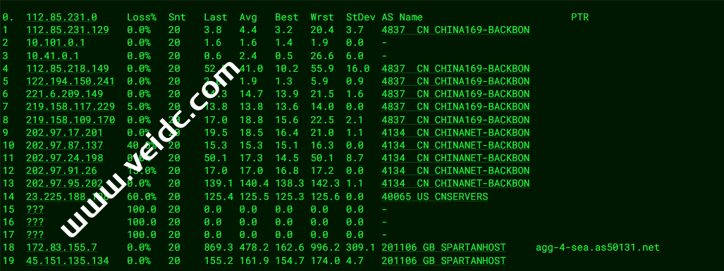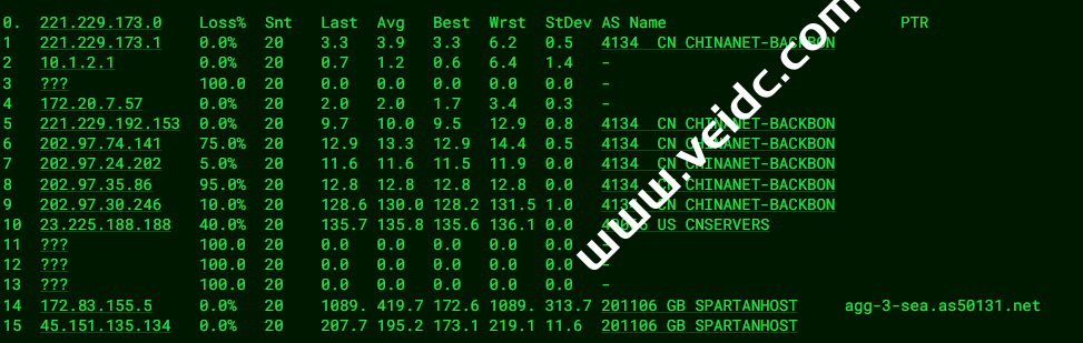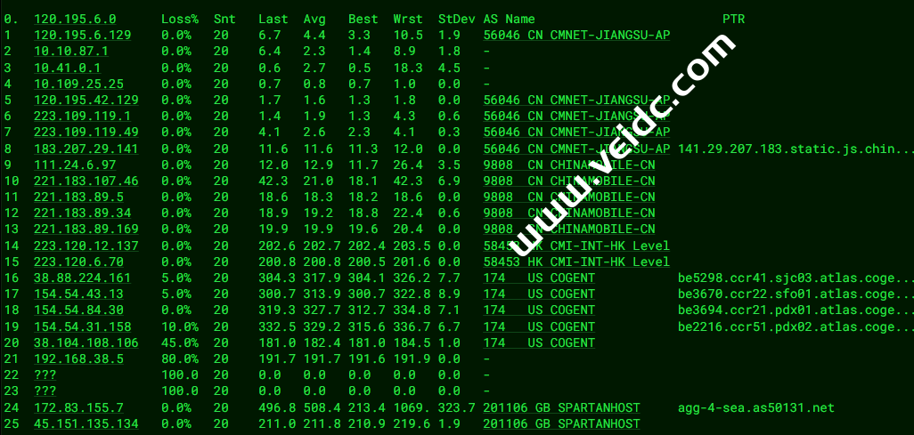 [Info] 测试路由 到 上海电信(天翼云) 中 ... traceroute to 101.227.255.45 (101.227.255.45), 30 hops max, 32 byte packets 1 45.151.135.129 11.68 ms AS201106 United States, Washington, Seattle, spartanhost.org 2 agg-3-sea.as50131.net (172.83.155.4) 0.58 ms AS201106 United States, Washington, Seattle, spartanhost.org 3 six.cnservers.com (206.81.81.38) 5.20 ms * United States, Washington, Seattle, seattleix.net 4 * 5 23.225.225.65 148.87 ms AS40065 United States, California, Los Angeles, ceranetworks.com 6 219.158.116.237 152.90 ms AS4837 China, Shanghai, ChinaUnicom 7 219.158.8.177 151.79 ms AS4837 China, Shanghai, ChinaUnicom 8 219.158.7.133 150.09 ms AS4837 China, Shanghai, ChinaUnicom 9 219.158.112.226 154.66 ms AS4837 China, Shanghai, ChinaUnicom 10 202.97.17.185 152.26 ms AS4134 China, Shanghai, ChinaTelecom 11 * 12 101.95.120.153 144.07 ms AS4812 China, Shanghai, ChinaTelecom 13 101.95.207.230 144.93 ms AS4812 China, Shanghai, ChinaTelecom 14 * 15 * 16 * 17 * 18 * 19 * 20 * 21 * 22 * 23 * 24 * 25 * 26 * 27 * 28 * 29 * 30 * [Info] 测试路由 到 上海电信(天翼云) 完成 ! [Info] 测试路由 到 厦门电信CN2 中 ... traceroute to 117.28.254.129 (117.28.254.129), 30 hops max, 32 byte packets 1 45.151.135.129 11.91 ms AS201106 United States, Washington, Seattle, spartanhost.org 2 agg-4-sea.as50131.net (172.83.155.6) 0.36 ms AS201106 United States, Washington, Seattle, spartanhost.org 3 189.97.225.104.ptr.anycast.net (104.225.97.189) 5.10 ms AS36236 United States, Washington, Seattle, netactuate.com 4 xe-2-3-3-1.a03.sttlwa01.us.bb.gin.ntt.net (129.250.203.81) 5.44 ms AS2914 United States, Washington, Seattle, ntt.com 5 ae-3.r24.sttlwa01.us.bb.gin.ntt.net (129.250.2.98) 6.29 ms AS2914 United States, Washington, Seattle, ntt.com 6 ae-13.r30.tokyjp05.jp.bb.gin.ntt.net (129.250.4.143) 86.36 ms AS2914 Japan, Tokyo, ntt.com 7 ae-2.r01.tokyjp08.jp.bb.gin.ntt.net (129.250.6.131) 92.80 ms AS2914 Japan, Tokyo, ntt.com 8 ae-2.a00.tokyjp04.jp.bb.gin.ntt.net (129.250.2.69) 93.44 ms AS2914 Japan, Tokyo, ntt.com 9 xe-0-0-12-1.a00.tokyjp04.jp.ce.gin.ntt.net (120.88.54.134) 110.54 ms AS2914 Japan, Tokyo, ntt.com 10 59.43.184.177 131.95 ms * China, Shanghai, ChinaTelecom 11 * 12 59.43.130.209 134.05 ms * China, Shanghai, ChinaTelecom 13 59.43.138.186 164.40 ms * China, Fujian, ChinaTelecom 14 * 15 * 16 * 17 * 18 117.28.254.129 167.62 ms AS4809 China, Fujian, Xiamen, ChinaTelecom [Info] 测试路由 到 厦门电信CN2 完成 ! [Info] 测试路由 到 浙江杭州联通 中 ... traceroute to 101.71.241.238 (101.71.241.238), 30 hops max, 32 byte packets 1 45.151.135.129 8.81 ms AS201106 United States, Washington, Seattle, spartanhost.org 2 agg-4-sea.as50131.net (172.83.155.6) 0.46 ms AS201106 United States, Washington, Seattle, spartanhost.org 3 six.cnservers.com (206.81.81.38) 5.10 ms * United States, Washington, Seattle, seattleix.net 4 * 5 23.225.225.65 155.40 ms AS40065 United States, California, Los Angeles, ceranetworks.com 6 219.158.116.237 154.81 ms AS4837 China, Shanghai, ChinaUnicom 7 219.158.8.177 153.87 ms AS4837 China, Shanghai, ChinaUnicom 8 219.158.7.133 151.40 ms AS4837 China, Shanghai, ChinaUnicom 9 219.158.115.150 159.54 ms AS4837 China, Zhejiang, Hangzhou, ChinaUnicom 10 101.69.245.206 160.01 ms AS4837 China, Zhejiang, Hangzhou, ChinaUnicom 11 * 12 * 13 * 14 * 15 * 16 * 17 * 18 * 19 * 20 * 21 * 22 * 23 * 24 * 25 * 26 * 27 * 28 * 29 * 30 * [Info] 测试路由 到 浙江杭州联通 完成 ! [Info] 测试路由 到 浙江杭州移动 中 ... traceroute to 112.17.0.106 (112.17.0.106), 30 hops max, 32 byte packets 1 45.151.135.129 18.75 ms AS201106 United States, Washington, Seattle, spartanhost.org 2 agg-1-sea.as50131.net (172.83.154.1) 0.40 ms AS201106 United States, Washington, Seattle, spartanhost.org 3 six.cnservers.com (206.81.81.38) 5.16 ms * United States, Washington, Seattle, seattleix.net 4 * 5 23.225.225.65 147.33 ms AS40065 United States, California, Los Angeles, ceranetworks.com 6 219.158.97.181 150.49 ms AS4837 China, Shanghai, ChinaUnicom 7 219.158.113.138 151.01 ms AS4837 China, Shanghai, ChinaUnicom 8 219.158.113.101 140.94 ms AS4837 China, Shanghai, ChinaUnicom 9 219.158.15.206 155.17 ms AS4837 China, Zhejiang, Hangzhou, ChinaUnicom 10 219.158.112.94 154.36 ms AS4837 China, Zhejiang, Hangzhou, ChinaUnicom 11 * 12 221.183.95.121 197.09 ms AS9808 China, Zhejiang, Hangzhou, ChinaMobile 13 * 14 * 15 * 16 * 17 * 18 * 19 * 20 * 21 * 22 * 23 * 24 * 25 * 26 * 27 * 28 * 29 * 30 * [Info] 测试路由 到 浙江杭州移动 完成 ! [Info] 测试路由 到 北京教育网 中 ... traceroute to 202.205.6.30 (202.205.6.30), 30 hops max, 32 byte packets 1 45.151.135.129 5.30 ms AS201106 United States, Washington, Seattle, spartanhost.org 2 agg-3-sea.as50131.net (172.83.155.4) 0.45 ms AS201106 United States, Washington, Seattle, spartanhost.org 3 189.97.225.104.ptr.anycast.net (104.225.97.189) 5.79 ms AS36236 United States, Washington, Seattle, netactuate.com 4 te0-3-1-9.ccr22.sea02.atlas.cogentco.com (38.142.50.217) 5.46 ms AS174 United States, Washington, Seattle, cogentco.com 5 be3716.ccr21.sfo01.atlas.cogentco.com (154.54.86.105) 20.52 ms AS174 United States, California, San Francisco, cogentco.com 6 be3178.ccr21.sjc01.atlas.cogentco.com (154.54.43.70) 21.48 ms AS174 United States, California, San Jose, cogentco.com 7 be3176.ccr41.lax01.atlas.cogentco.com (154.54.31.189) 33.41 ms AS174 United States, California, Los Angeles, cogentco.com 8 be3271.ccr41.lax04.atlas.cogentco.com (154.54.42.102) 34.28 ms AS174 United States, California, Los Angeles, cogentco.com 9 38.88.196.186 197.97 ms AS174 United States, California, Los Angeles, cogentco.com 10 101.4.117.169 195.45 ms AS4538 China, Beijing, CHINAEDU 11 * 12 101.4.118.213 194.48 ms AS4538 China, Beijing, CHINAEDU 13 101.4.113.110 194.58 ms AS4538 China, Beijing, CHINAEDU 14 219.224.102.230 195.38 ms AS4538 China, Beijing, CHINAEDU 15 * 16 * 17 101.4.130.54 196.57 ms AS4538 China, Beijing, CHINAEDU 18 * 19 * 20 * 21
