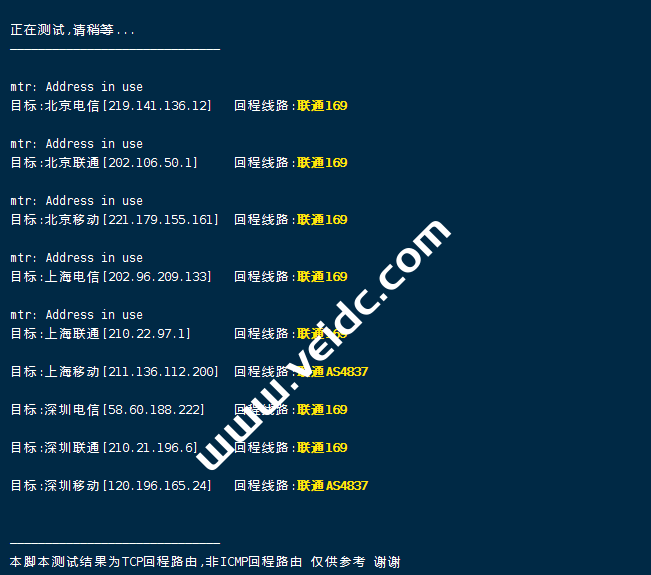 一键检测VPS回程国内三网路由