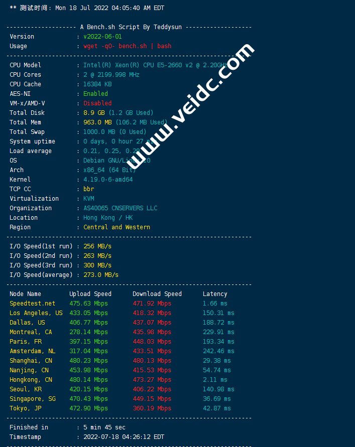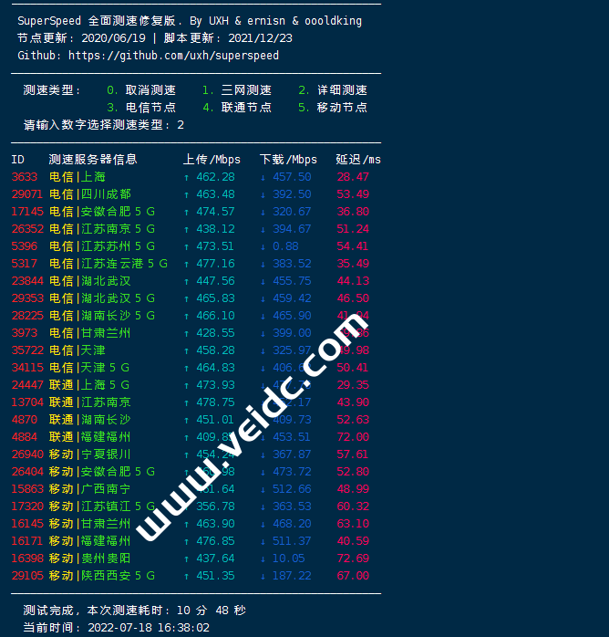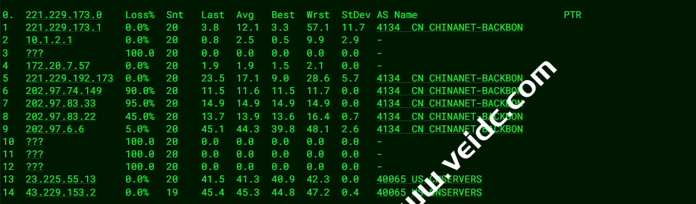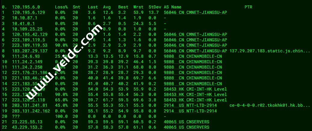 [Info] 测试路由 到 上海电信(天翼云) 中 ... traceroute to 101.227.255.45 (101.227.255.45), 30 hops max, 32 byte packets 1 103.135.34.137 0.62 ms AS40065 China, Hong Kong, ceranetworks.com 2 23.225.55.2 0.62 ms AS40065 China, Hong Kong, ceranetworks.com 3 23.225.55-33.ceranetworks.com (23.225.55.33) 0.71 ms AS40065 China, Hong Kong, ceranetworks.com 4 23.225.55.54 2.53 ms AS40065 China, Hong Kong, ceranetworks.com 5 223.120.2.53 2.49 ms AS58453 China, Hong Kong, ChinaMobile 6 223.120.3.186 29.59 ms AS58453 China, Shanghai, ChinaMobile 7 221.183.89.170 30.55 ms AS9808 China, Shanghai, ChinaMobile 8 221.183.89.33 30.39 ms AS9808 China, Shanghai, ChinaMobile 9 221.183.89.10 32.20 ms AS9808 China, Shanghai, ChinaMobile 10 221.183.90.238 33.10 ms AS9808 China, Shanghai, ChinaMobile 11 221.183.90.158 33.30 ms AS9808 China, Shanghai, ChinaMobile 12 * 13 61.152.26.13 30.24 ms AS4812 China, Shanghai, ChinaTelecom 14 * 15 * 16 * 17 * 18 * 19 * 20 * 21 * 22 * 23 * 24 * 25 * 26 * 27 * 28 * 29 * 30 * [Info] 测试路由 到 上海电信(天翼云) 完成 ! [Info] 测试路由 到 厦门电信CN2 中 ... traceroute to 117.28.254.129 (117.28.254.129), 30 hops max, 32 byte packets 1 103.135.34.137 4.15 ms AS40065 China, Hong Kong, ceranetworks.com 2 23.225.55.2 0.80 ms AS40065 China, Hong Kong, ceranetworks.com 3 23.225.55-33.ceranetworks.com (23.225.55.33) 1.25 ms AS40065 China, Hong Kong, ceranetworks.com 4 ce-0-1-0-2.r02.tkokhk01.hk.bb.gin.ntt.net (203.131.241.109) 9.83 ms AS2914 China, Hong Kong, ntt.com 5 ae-7.r26.tkokhk01.hk.bb.gin.ntt.net (129.250.6.93) 1.31 ms AS2914 China, Hong Kong, ntt.com 6 ae-2.a01.chwahk02.hk.bb.gin.ntt.net (129.250.6.123) 6.45 ms AS2914 China, Hong Kong, ntt.com 7 xe-0-0-18-2.a01.chwahk02.hk.ce.gin.ntt.net (203.131.241.70) 5.28 ms AS2914 China, Hong Kong, ntt.com 8 59.43.188.121 7.11 ms * China, Guangdong, Guangzhou, ChinaTelecom 9 * 10 59.43.130.125 9.58 ms * China, Guangdong, Guangzhou, ChinaTelecom 11 59.43.46.214 24.84 ms * China, Fujian, ChinaTelecom 12 * 13 * 14 * 15 * 16 117.28.254.129 28.43 ms AS4809 China, Fujian, Xiamen, ChinaTelecom [Info] 测试路由 到 厦门电信CN2 完成 ! [Info] 测试路由 到 浙江杭州联通 中 ... traceroute to 101.71.241.238 (101.71.241.238), 30 hops max, 32 byte packets 1 103.135.34.137 0.74 ms AS40065 China, Hong Kong, ceranetworks.com 2 23.225.55.2 0.77 ms AS40065 China, Hong Kong, ceranetworks.com 3 23.225.55-33.ceranetworks.com (23.225.55.33) 1.12 ms AS40065 China, Hong Kong, ceranetworks.com 4 23.225.55.54 2.08 ms AS40065 China, Hong Kong, ceranetworks.com 5 223.120.2.53 6.52 ms AS58453 China, Hong Kong, ChinaMobile 6 223.120.3.186 30.82 ms AS58453 China, Shanghai, ChinaMobile 7 221.183.89.174 30.82 ms AS9808 China, Shanghai, ChinaMobile 8 221.183.89.69 30.83 ms AS9808 China, Shanghai, ChinaMobile 9 221.183.89.46 32.19 ms AS9808 China, Shanghai, ChinaMobile 10 221.183.73.102 35.18 ms AS9808 China, Zhejiang, Jinhua, ChinaMobile 11 * 12 219.158.44.41 46.18 ms AS4837 China, Zhejiang, Hangzhou, ChinaUnicom 13 219.158.7.205 39.94 ms AS4837 China, Zhejiang, Hangzhou, ChinaUnicom 14 * 15 * 16 * 17 * 18 * 19 * 20 * 21 * 22 * 23 * 24 * 25 * 26 * 27 * 28 * 29 * 30 * [Info] 测试路由 到 浙江杭州联通 完成 ! [Info] 测试路由 到 浙江杭州移动 中 ... traceroute to 112.17.0.106 (112.17.0.106), 30 hops max, 32 byte packets 1 103.135.34.137 1.53 ms AS40065 China, Hong Kong, ceranetworks.com 2 23.225.55.2 0.90 ms AS40065 China, Hong Kong, ceranetworks.com 3 23.225.55-33.ceranetworks.com (23.225.55.33) 0.71 ms AS40065 China, Hong Kong, ceranetworks.com 4 23.225.55.54 15.71 ms AS40065 China, Hong Kong, ceranetworks.com 5 223.120.2.53 2.00 ms AS58453 China, Hong Kong, ChinaMobile 6 223.120.2.6 8.21 ms AS58453 China, Guangdong, Guangzhou, ChinaMobile 7 223.120.22.5 33.09 ms AS58453 China, Shanghai, ChinaMobile 8 221.183.55.30 33.56 ms AS9808 China, Shanghai, ChinaMobile 9 221.183.25.189 33.51 ms AS9808 China, Shanghai, ChinaMobile 10 221.176.22.9 35.26 ms AS9808 China, Shanghai, ChinaMobile 11 111.24.3.93 41.95 ms AS9808 China, Shanghai, ChinaMobile 12 221.183.109.34 42.40 ms AS9808 China, Zhejiang, Hangzhou, ChinaMobile 13 * 14 117.148.185.114 42.40 ms AS56041 China, Zhejiang, Hangzhou, ChinaMobile 15 * 16 * 17 * 18 * 19 * 20 * 21 * 22 * 23 * 24 * 25 * 26 * 27 * 28 * 29 * 30 * [Info] 测试路由 到 浙江杭州移动 完成 ! [Info] 测试路由 到 北京教育网 中 ... traceroute to 202.205.6.30 (202.205.6.30), 30 hops max, 32 byte packets 1 103.135.34.137 1373.33 ms AS40065 China, Hong Kong, ceranetworks.com 2 23.225.55.2 0.84 ms AS40065 China, Hong Kong, ceranetworks.com 3 23.225.55-33.ceranetworks.com (23.225.55.33) 0.99 ms AS40065 China, Hong Kong, ceranetworks.com 4 multidata1-10g.hkix.net (123.255.91.118) 1.86 ms * China, Hong Kong, hkix.net 5 101.4.114.181 37.60 ms AS4538 China, Beijing, CHINAEDU 6 * 7 * 8 101.4.118.213 38.07 ms AS4538 China, Beijing, CHINAEDU 9 101.4.113.110 38.39 ms AS4538 China, Beijing, CHINAEDU 10 219.224.102.230 37.92 ms AS4538 China, Beijing, CHINAEDU 11 * 12 * 13 * 14 * 15 * 16 101.4.130.53 44.67 ms AS4538 China, Beijing, CHINAEDU 17 * 18 * 19 * 20 * 21 * 22 * 23 * 24 * 25 * 26 * 27 101.4.130.54 38.71 ms AS4538 China, Beijing, CHINAEDU 28 * 29 101.4.130.54 39.61 ms AS4538 China, Beijing, CHINAEDU 30 * [Info] 测试路由 到 北京教育网 完成 ! [Info] 四网路由快速测试 已完成 !