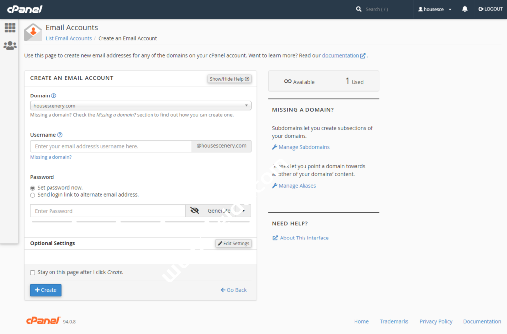 - Username – 自由填写,比如info,sales, 或者support或用户名字,chemicloud提供无限的邮箱,虽说无限,但是不能超过你主机的空间