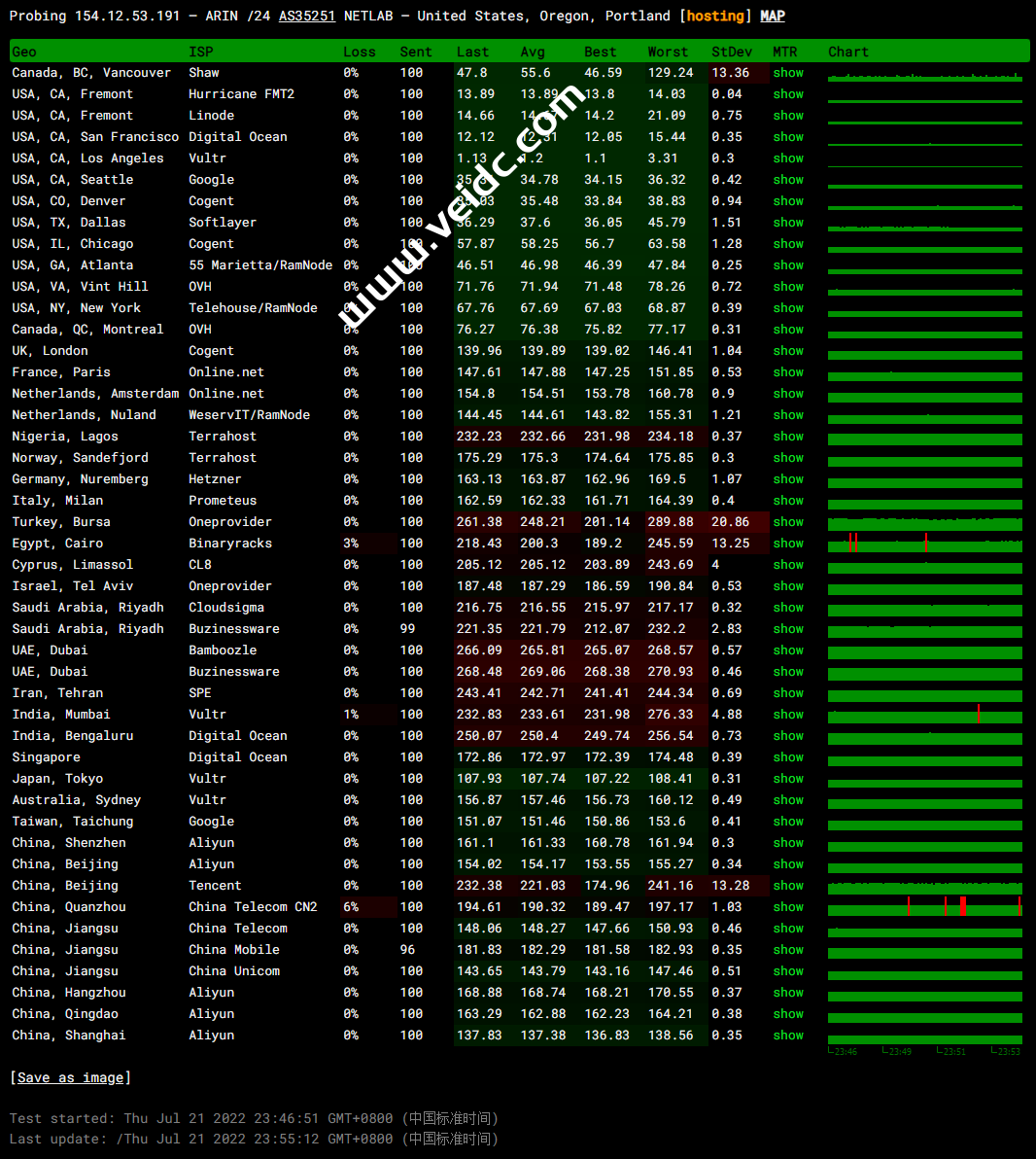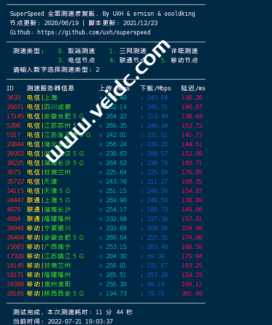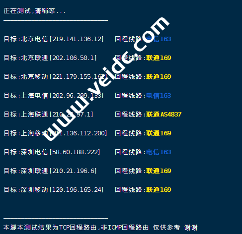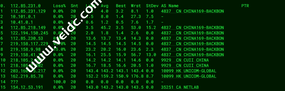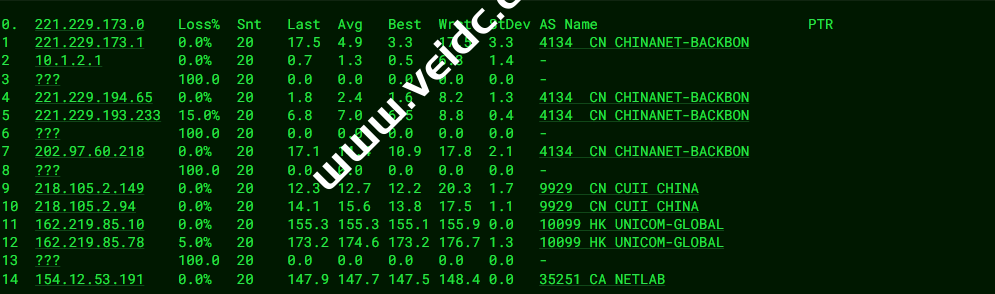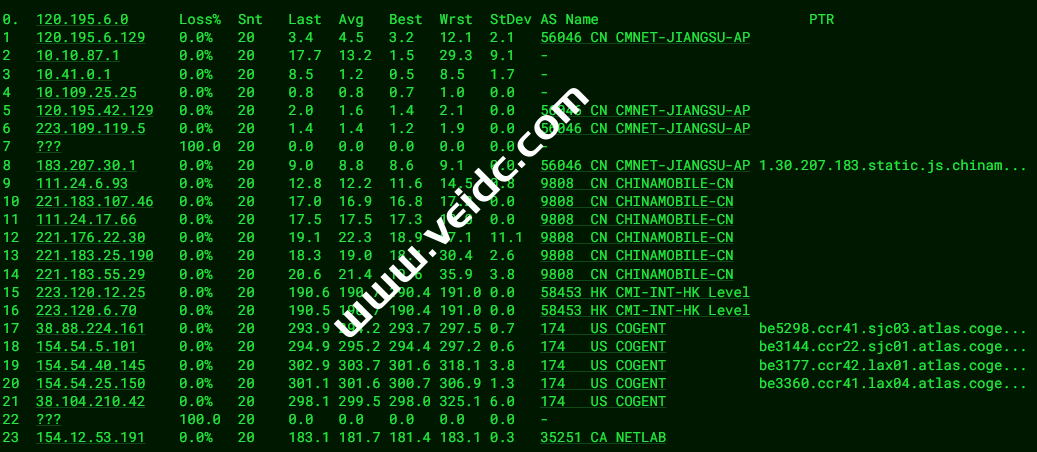 [Info] 测试路由 到 上海电信(天翼云) 中 ... traceroute to 101.227.255.45 (101.227.255.45), 30 hops max, 32 byte packets 1 _gateway (154.12.53.254) 4.91 ms AS35251 United States, California, Los Angeles, cogentco.com 2 10.9.8.7 0.78 ms * LAN Address 3 162.219.85.77 0.88 ms AS10099 United States, ChinaUnicom 4 203.160.75.218 130.54 ms AS10099 China, Hong Kong, ChinaUnicom 5 218.105.2.89 129.46 ms AS9929 China, Shanghai, ChinaUnicom 6 218.105.2.150 133.58 ms AS9929 China, Shanghai, ChinaUnicom 7 202.97.16.65 132.20 ms AS4134 China, Shanghai, ChinaTelecom 8 202.97.87.125 131.97 ms AS4134 China, Shanghai, ChinaTelecom 9 * 10 * 11 * 12 * 13 * 14 * 15 * 16 * 17 * 18 * 19 * 20 * 21 * 22 * 23 * 24 * 25 * 26 * 27 * 28 * 29 * 30 * [Info] 测试路由 到 上海电信(天翼云) 完成 ! [Info] 测试路由 到 厦门电信CN2 中 ... traceroute to 117.28.254.129 (117.28.254.129), 30 hops max, 32 byte packets 1 _gateway (154.12.53.254) 14.31 ms AS35251 United States, California, Los Angeles, cogentco.com 2 10.4.5.6 0.48 ms * LAN Address 3 162.219.85.77 0.87 ms AS10099 United States, ChinaUnicom 4 162.219.85.5 130.95 ms AS10099 China, Shanghai, ChinaUnicom 5 218.105.2.89 129.36 ms AS9929 China, Shanghai, ChinaUnicom 6 218.105.131.101 157.54 ms AS9929 China, Beijing, ChinaUnicom 7 210.78.30.142 150.84 ms * China, ChinaUnicom 8 219.158.35.33 154.00 ms AS4837 China, Beijing, ChinaUnicom 9 219.158.5.117 152.91 ms AS4837 China, Beijing, ChinaUnicom 10 219.158.109.186 163.66 ms AS4837 China, Beijing, ChinaUnicom 11 219.158.40.166 170.50 ms AS4837 China, Beijing, ChinaUnicom 12 * 13 * 14 * 15 110.80.128.90 174.38 ms AS133775 China, Fujian, Xiamen, ChinaTelecom 16 * 17 * 18 * 19 117.28.254.129 194.02 ms AS4809 China, Fujian, Xiamen, ChinaTelecom [Info] 测试路由 到 厦门电信CN2 完成 ! [Info] 测试路由 到 浙江杭州联通 中 ... traceroute to 101.71.241.238 (101.71.241.238), 30 hops max, 32 byte packets 1 _gateway (154.12.53.254) 16.82 ms AS35251 United States, California, Los Angeles, cogentco.com 2 10.9.8.7 0.56 ms * LAN Address 3 162.219.85.77 0.88 ms AS10099 United States, ChinaUnicom 4 162.219.85.1 137.05 ms AS10099 China, Shanghai, ChinaUnicom 5 218.105.2.205 129.75 ms AS9929 China, Shanghai, ChinaUnicom 6 218.105.2.174 137.01 ms AS9929 China, Shanghai, ChinaUnicom 7 219.158.44.209 138.15 ms AS4837 China, Shanghai, ChinaUnicom 8 219.158.113.197 131.74 ms AS4837 China, Shanghai, ChinaUnicom 9 219.158.106.94 147.12 ms AS4837 China, Zhejiang, Hangzhou, ChinaUnicom 10 * 11 * 12 * 13 * 14 * 15 * 16 * 17 * 18 * 19 * 20 * 21 * 22 * 23 * 24 * 25 * 26 * 27 * 28 * 29 * 30 * [Info] 测试路由 到 浙江杭州联通 完成 ! [Info] 测试路由 到 浙江杭州移动 中 ... traceroute to 112.17.0.106 (112.17.0.106), 30 hops max, 32 byte packets 1 _gateway (154.12.53.254) 15.70 ms AS35251 United States, California, Los Angeles, cogentco.com 2 10.4.5.6 0.42 ms * LAN Address 3 162.219.85.77 0.86 ms AS10099 United States, ChinaUnicom 4 203.160.75.218 130.42 ms AS10099 China, Hong Kong, ChinaUnicom 5 218.105.2.201 136.46 ms AS9929 China, Shanghai, ChinaUnicom 6 218.105.2.174 136.97 ms AS9929 China, Shanghai, ChinaUnicom 7 219.158.113.153 131.64 ms AS4837 China, Shanghai, ChinaUnicom 8 219.158.113.197 133.14 ms AS4837 China, Shanghai, ChinaUnicom 9 219.158.115.150 146.26 ms AS4837 China, Zhejiang, Hangzhou, ChinaUnicom 10 219.158.7.206 148.27 ms AS4837 China, Zhejiang, Hangzhou, ChinaUnicom 11 219.158.43.50 165.70 ms AS4837 China, Zhejiang, Hangzhou, ChinaUnicom 12 221.183.95.121 168.12 ms AS9808 China, Zhejiang, Hangzhou, ChinaMobile 13 * 14 * 15 * 16 * 17 * 18 * 19 * 20 * 21 * 22 * 23 * 24 * 25 * 26 * 27 * 28 * 29 * 30 * [Info] 测试路由 到 浙江杭州移动 完成 ! [Info] 测试路由 到 北京教育网 中 ... traceroute to 202.205.6.30 (202.205.6.30), 30 hops max, 32 byte packets 1 _gateway (154.12.53.254) 12.13 ms AS35251 United States, California, Los Angeles, cogentco.com 2 10.4.5.6 0.47 ms * LAN Address 3 162.219.85.77 0.77 ms AS10099 United States, ChinaUnicom 4 162.219.85.9 137.99 ms AS10099 China, Shanghai, ChinaUnicom 5 218.105.2.89 136.71 ms AS9929 China, Shanghai, ChinaUnicom 6 218.105.2.150 138.79 ms AS9929 China, Shanghai, ChinaUnicom 7 219.158.113.153 140.72 ms AS4837 China, Shanghai, ChinaUnicom 8 219.158.44.86 160.83 ms AS4837 China, Shanghai, ChinaUnicom 9 101.4.118.41 163.15 ms AS4538 China, Shanghai, CHINAEDU 10 101.4.117.30 161.37 ms AS4538 China, Beijing, CHINAEDU 11 101.4.116.118 164.44 ms AS4538 China, Beijing, CHINAEDU 12 101.4.112.69 163.07 ms AS4538 China, Beijing, CHINAEDU 13 101.4.113.110 160.70 ms AS4538 China, Beijing, CHINAEDU 14 219.224.102.230 168.42 ms AS4538 China, Beijing, CHINAEDU 15 * 16 * 17 * 18 * 19 * 20 * 21 101.4.130.54 164.36 ms AS4538 China, Beijing, CHINAEDU 22 * 23 * 24 * 25 * 26 101.4.130.53 167.90 ms AS4538 China, Beijing, CHINAEDU 27 101.4.130.54 165.99 ms AS4538 China, Beijing, CHINAEDU 28 * 29 * 30 * [Info] 测试路由 到 北京教育网 完成 ! [Info] 四网路由快速测试 已完成 !
