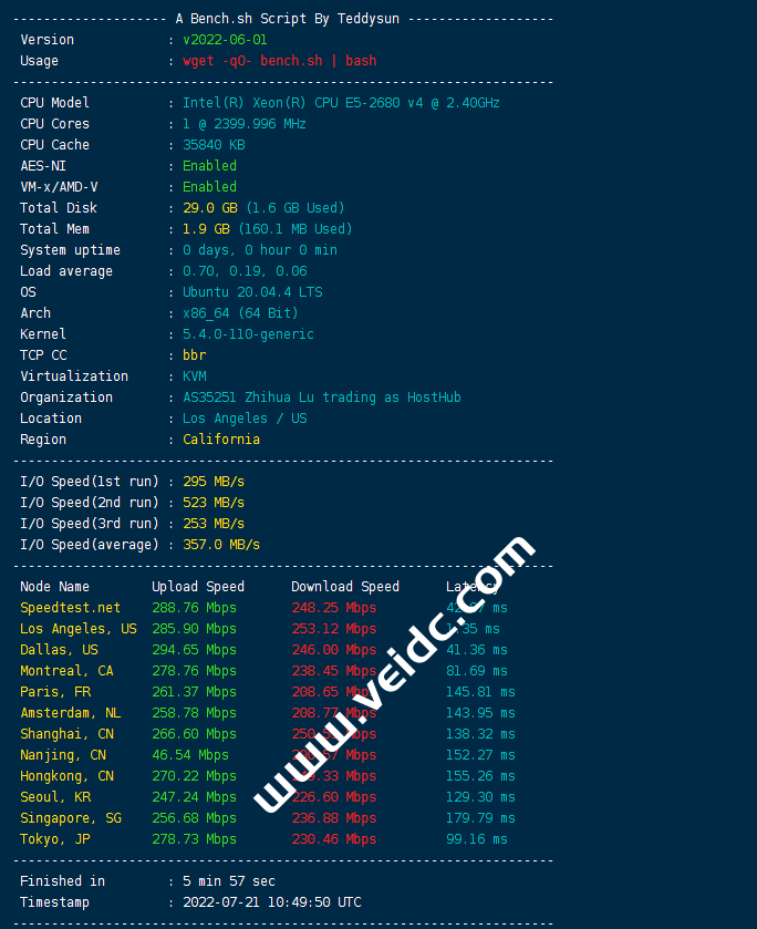前面介绍了DigitalVirt,这是一家国人新商家,目前主要经营美国洛杉矶 9929线路VPS、香港CN2建站机,洛杉矶QN机房VPS也将很快上线,目前最有特色的就是洛杉矶 9929线路VPS,国外主机测评第一时间拿到一台机器,准备先行试水,测试一下具体表现如何。