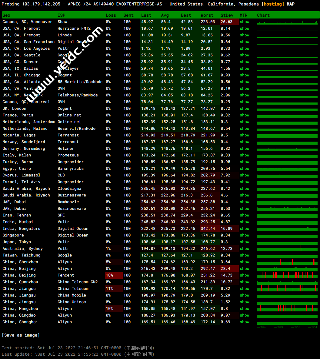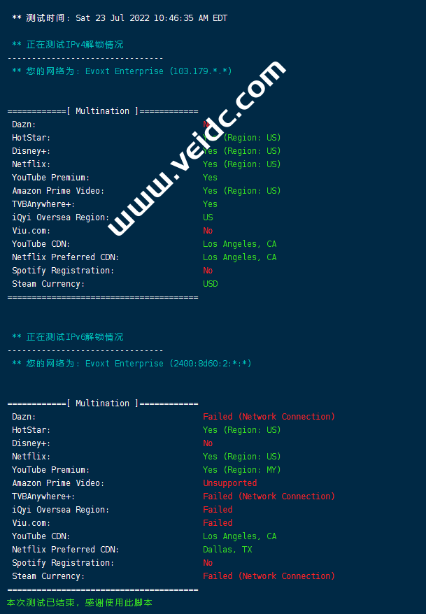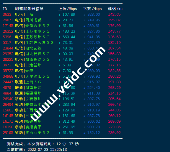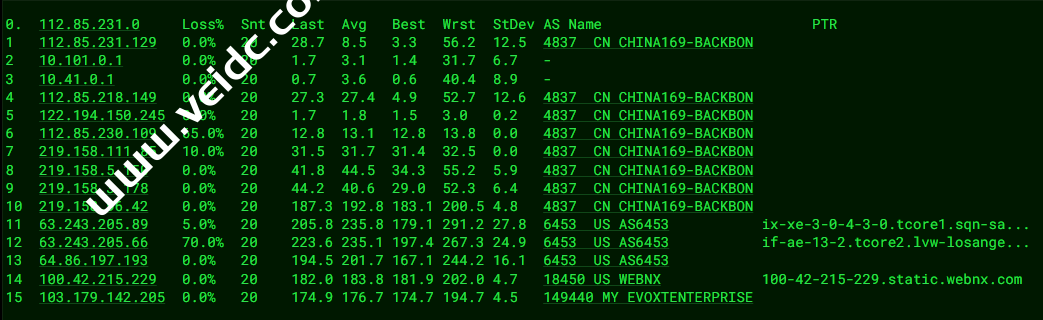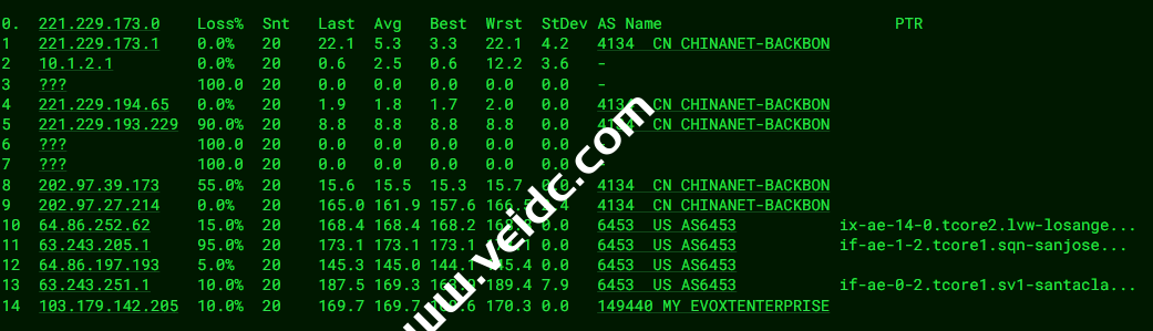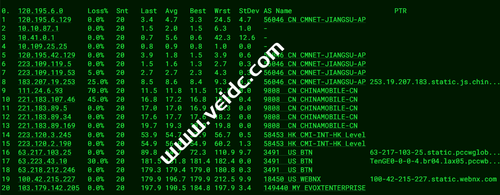 [Info] 测试路由 到 上海电信(天翼云) 中 ... traceroute to 101.227.255.45 (101.227.255.45), 30 hops max, 32 byte packets 1 64-185-230-241.static.webnx.com (64.185.230.241) 0.45 ms AS18450 United States, California, Los Angeles, webnx.com 2 100-42-215-226.static.webnx.com (100.42.215.226) 0.77 ms AS18450 United States, California, Los Angeles, webnx.com 3 las-b3-link.ip.twelve99.net (213.248.77.74) 13.76 ms AS1299 United States, California, Los Angeles, telia.com 4 chinatelecom-ic-368151-las-b22.c.telia.net (62.115.185.213) 2.97 ms AS1299 United States, California, Los Angeles, telia.com 5 * 6 * 7 202.97.24.249 155.04 ms AS4134 China, Shanghai, ChinaTelecom 8 61.152.26.93 163.58 ms AS4812 China, Shanghai, ChinaTelecom 9 * 10 * 11 * 12 * 13 * 14 * 15 * 16 * 17 * 18 * 19 * 20 * 21 * 22 * 23 * 24 * 25 * 26 * 27 * 28 * 29 * 30 * [Info] 测试路由 到 上海电信(天翼云) 完成 ! [Info] 测试路由 到 厦门电信CN2 中 ... traceroute to 117.28.254.129 (117.28.254.129), 30 hops max, 32 byte packets 1 64-185-230-241.static.webnx.com (64.185.230.241) 0.43 ms AS18450 United States, California, Los Angeles, webnx.com 2 100-42-215-226.static.webnx.com (100.42.215.226) 0.78 ms AS18450 United States, California, Los Angeles, webnx.com 3 las-b3-link.ip.twelve99.net (213.248.77.74) 1.09 ms AS1299 United States, California, Los Angeles, telia.com 4 chinatelecom-ic320371-las-b24.ip.twelve99-cust.net (213.248.79.253) 1.16 ms AS1299 United States, California, Los Angeles, telia.com 5 59.43.182.81 149.96 ms * China, Shanghai, ChinaTelecom 6 * 7 59.43.138.49 141.69 ms * China, Shanghai, ChinaTelecom 8 59.43.138.186 161.02 ms * China, Fujian, ChinaTelecom 9 * 10 * 11 * 12 * 13 117.28.254.129 165.02 ms AS4809 China, Fujian, Xiamen, ChinaTelecom [Info] 测试路由 到 厦门电信CN2 完成 ! [Info] 测试路由 到 浙江杭州联通 中 ... traceroute to 101.71.241.238 (101.71.241.238), 30 hops max, 32 byte packets 1 64-185-230-241.static.webnx.com (64.185.230.241) 0.47 ms AS18450 United States, California, Los Angeles, webnx.com 2 100-42-215-226.static.webnx.com (100.42.215.226) 0.85 ms AS18450 United States, California, Los Angeles, webnx.com 3 100-42-215-225.static.webnx.com (100.42.215.225) 0.77 ms AS18450 United States, California, Los Angeles, webnx.com 4 207.254.184.89 1.37 ms AS19174 United States, California, Los Angeles, ChinaUnicom 5 207.254.191.46 173.67 ms AS19174 United States, California, Los Angeles, ChinaUnicom 6 219.158.17.85 176.36 ms AS4837 China, Guangdong, Guangzhou, ChinaUnicom 7 219.158.97.30 179.72 ms AS4837 China, Guangdong, Guangzhou, ChinaUnicom 8 219.158.8.113 205.73 ms AS4837 China, Guangdong, Guangzhou, ChinaUnicom 9 219.158.106.70 218.28 ms AS4837 China, Zhejiang, Hangzhou, ChinaUnicom 10 * 11 * 12 * 13 * 14 * 15 * 16 * 17 * 18 * 19 * 20 * 21 * 22 * 23 * 24 * 25 * 26 * 27 * 28 * 29 * 30 * [Info] 测试路由 到 浙江杭州联通 完成 ! [Info] 测试路由 到 浙江杭州移动 中 ... traceroute to 112.17.0.106 (112.17.0.106), 30 hops max, 32 byte packets 1 64-185-230-241.static.webnx.com (64.185.230.241) 0.58 ms AS18450 United States, California, Los Angeles, webnx.com 2 100-42-215-226.static.webnx.com (100.42.215.226) 0.81 ms AS18450 United States, California, Los Angeles, webnx.com 3 100-42-215-225.static.webnx.com (100.42.215.225) 0.95 ms AS18450 United States, California, Los Angeles, webnx.com 4 207.254.184.89 1.31 ms AS19174 United States, California, Los Angeles, ChinaUnicom 5 207.254.191.98 158.07 ms AS19174 United States, California, Los Angeles, ChinaUnicom 6 219.158.17.81 165.95 ms AS4837 China, Beijing, ChinaUnicom 7 219.158.3.49 172.79 ms AS4837 China, Beijing, ChinaUnicom 8 * 9 219.158.14.6 216.81 ms AS4837 China, Zhejiang, Hangzhou, ChinaUnicom 10 * 11 * 12 221.183.95.121 202.69 ms AS9808 China, Zhejiang, Hangzhou, ChinaMobile 13 * 14 * 15 * 16 * 17 * 18 * 19 * 20 * 21 * 22 * 23 * 24 * 25 * 26 * 27 * 28 * 29 * 30 * [Info] 测试路由 到 浙江杭州移动 完成 ! [Info] 测试路由 到 北京教育网 中 ... traceroute to 202.205.6.30 (202.205.6.30), 30 hops max, 32 byte packets 1 64-185-230-241.static.webnx.com (64.185.230.241) 0.70 ms AS18450 United States, California, Los Angeles, webnx.com 2 100-42-215-226.static.webnx.com (100.42.215.226) 0.78 ms AS18450 United States, California, Los Angeles, webnx.com 3 eqix-la1.chinamobile.com (206.223.123.137) 8.17 ms * United States, California, Los Angeles, equinix.com 4 223.120.6.217 7.54 ms AS58453 United States, California, Los Angeles, ChinaMobile 5 223.120.3.86 153.82 ms AS58453 China, Hong Kong, ChinaMobile 6 223.119.81.94 154.26 ms AS58453 China, Hong Kong, ChinaMobile 7 101.4.114.181 183.61 ms AS4538 China, Beijing, CHINAEDU 8 101.4.114.238 189.11 ms AS4538 China, Beijing, CHINAEDU 9 * 10 101.4.118.213 189.99 ms AS4538 China, Beijing, CHINAEDU 11 101.4.113.110 181.60 ms AS4538 China, Beijing, CHINAEDU 12 219.224.102.230 192.07 ms AS4538 China, Beijing, CHINAEDU 13 * 14 * 15 * 16 * 17 * 18 * 19 * 20 * 21 * 22 * 23 * 24 * 25 101.4.130.54 192.92 ms AS4538 China, Beijing, CHINAEDU 26 101.4.130.53 194.11 ms AS4538 China, Beijing, CHINAEDU 27 101.4.130.54 192.65 ms AS4538 China, Beijing, CHINAEDU 28 * 29 * 30 * [Info] 测试路由 到 北京教育网 完成 ! [Info] 四网路由快速测试 已完成 !
