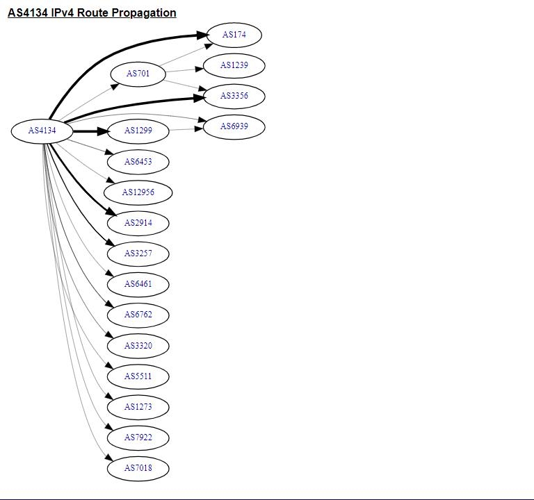 he.net上给出的运营商骨干网拓扑图显示,中国电信163网的自治路由是AS4134,从总体形状上不难看出163是一张“地位”比较高的网,很少通过transit来与其它运营商互联,上联运营商主要是NTT,cogenco,level3,he。