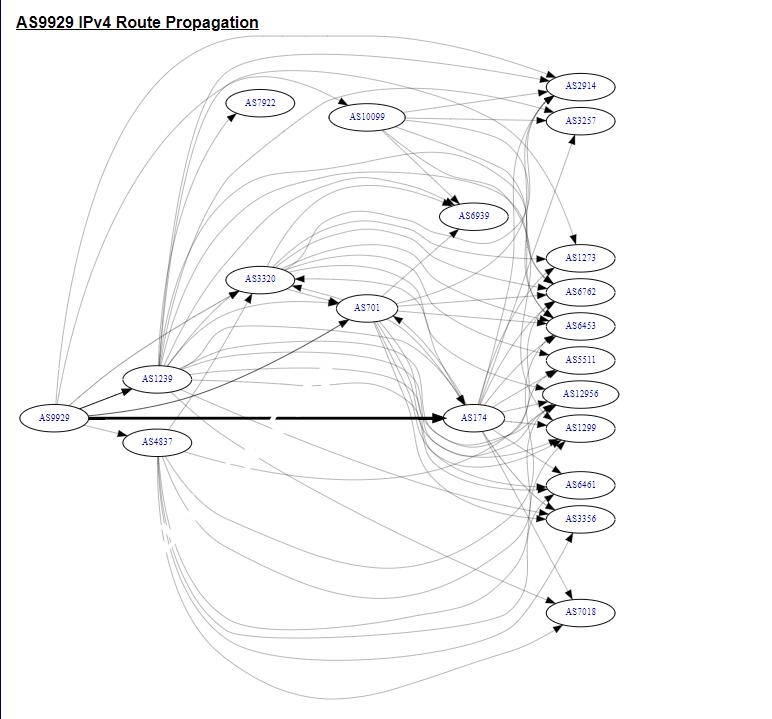 联通CUII的自治路由是AS9929,看起来和CN2有几分相似,同样也是通过较多的transit来互联,而且很大一部分流量去了cogenco(AS174)和Verizon(AS701)这种大型T1,可见对境外的互联性并不好。