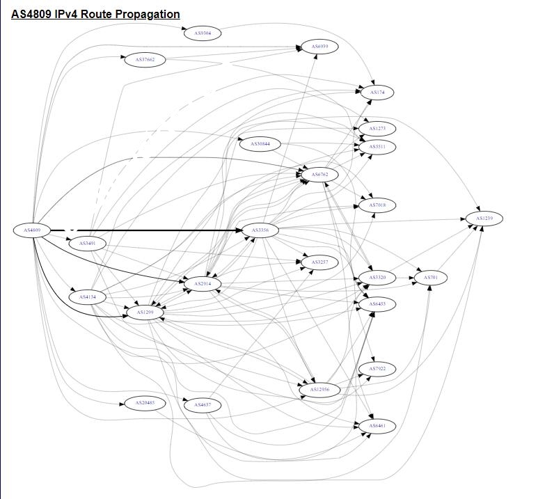 CN2的自治路由是AS4809,拓扑图就显得复杂不少,因为都是通过其它运营商的优质transit进行互联的,大大利用的运营商之间的互联性。