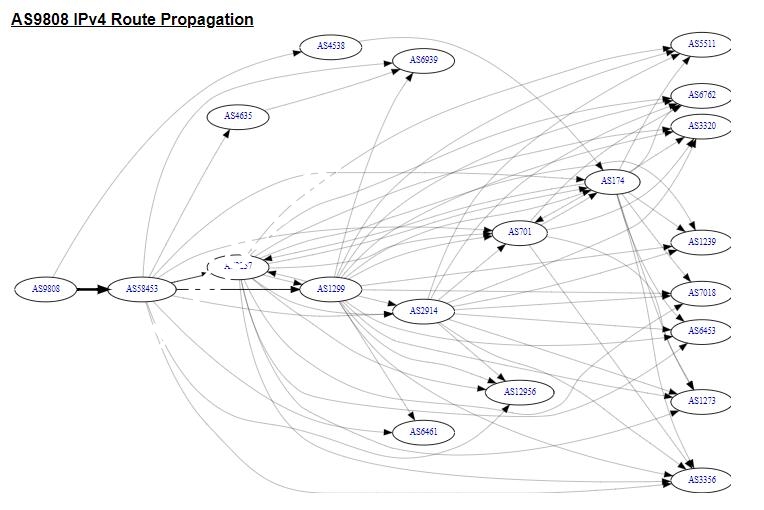 移动CMNET的自治路由是AS9808,CMI的自治路由是AS58453,可以看到移动的境外拓扑图也是比较复杂的,在策略上本身没有问题,问题只是在互联容量和用户量的矛盾上。CMI的上联运营商主要是PCCW,cogenco,telia,移动与香港PCCW的互联质量比电信联通都要好,这里是有原因的,移动与PCCW互联,是移动向PCCW掏钱买transit,电信联通与PCCW互联,是PCCW向电信联通掏钱买transit,这里网络质量就有了一些差距。