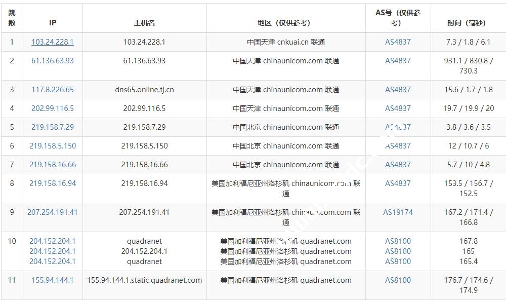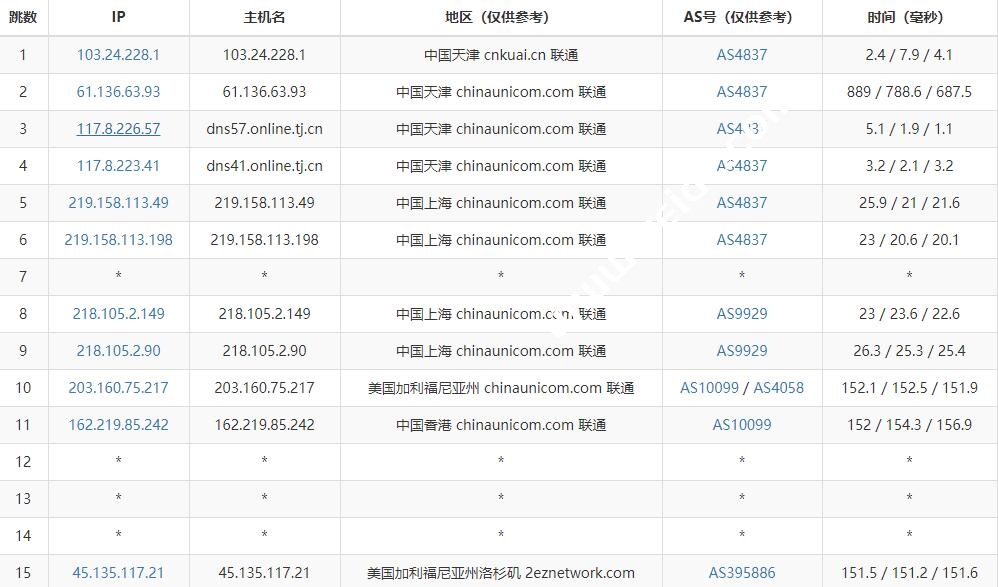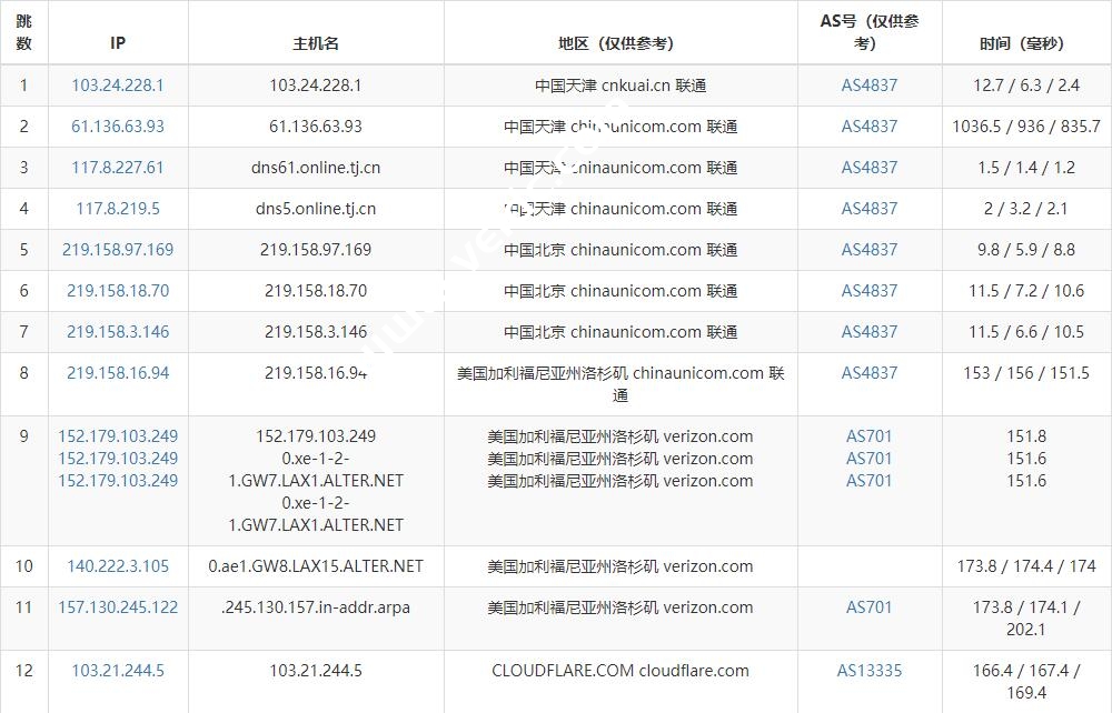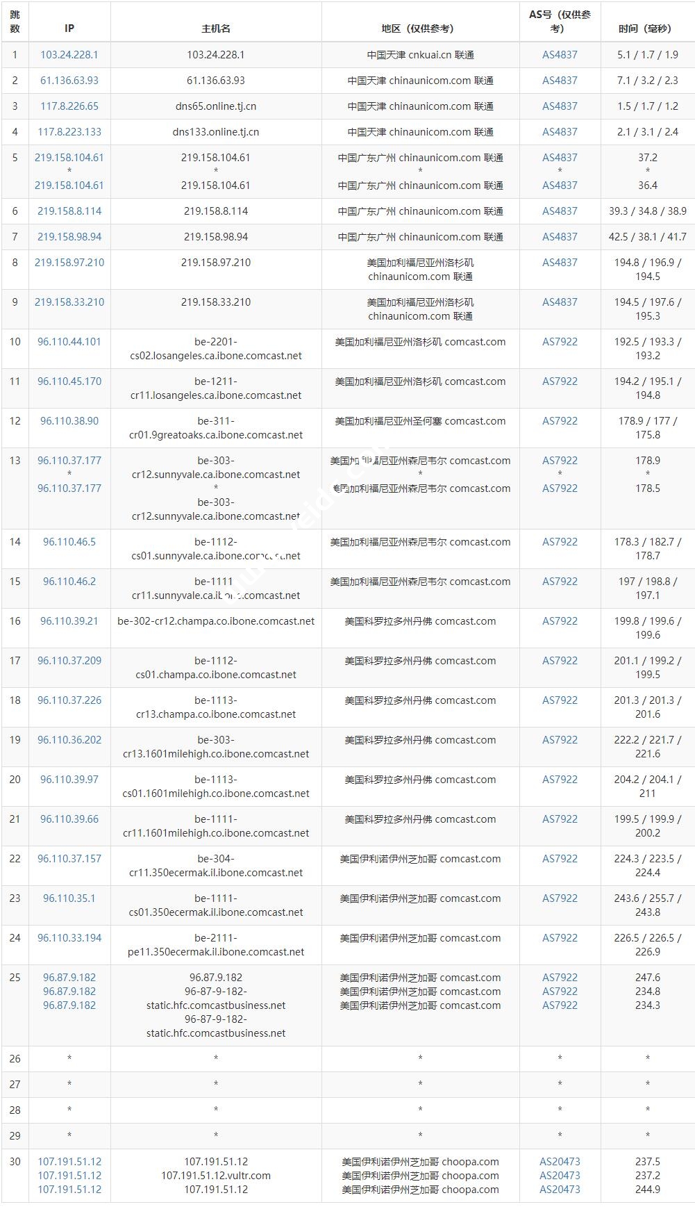 本身这张网是没什么可讲的,但自从北美CN2GIA商品变少之后,各大线路商就开始另辟蹊径了,连CUII这把老骨头都不放过。。。CUII就是原网通自建的AS9929网,合并重组后成为联通的政企工业网,由于常年的不升级,这张网的容量比较小,仅剩的优势只是负载轻而已,受到了部分主机商的喜爱,如下就是一条北美联通9929的去程路由,国际段是由CUG(10099)承载的: