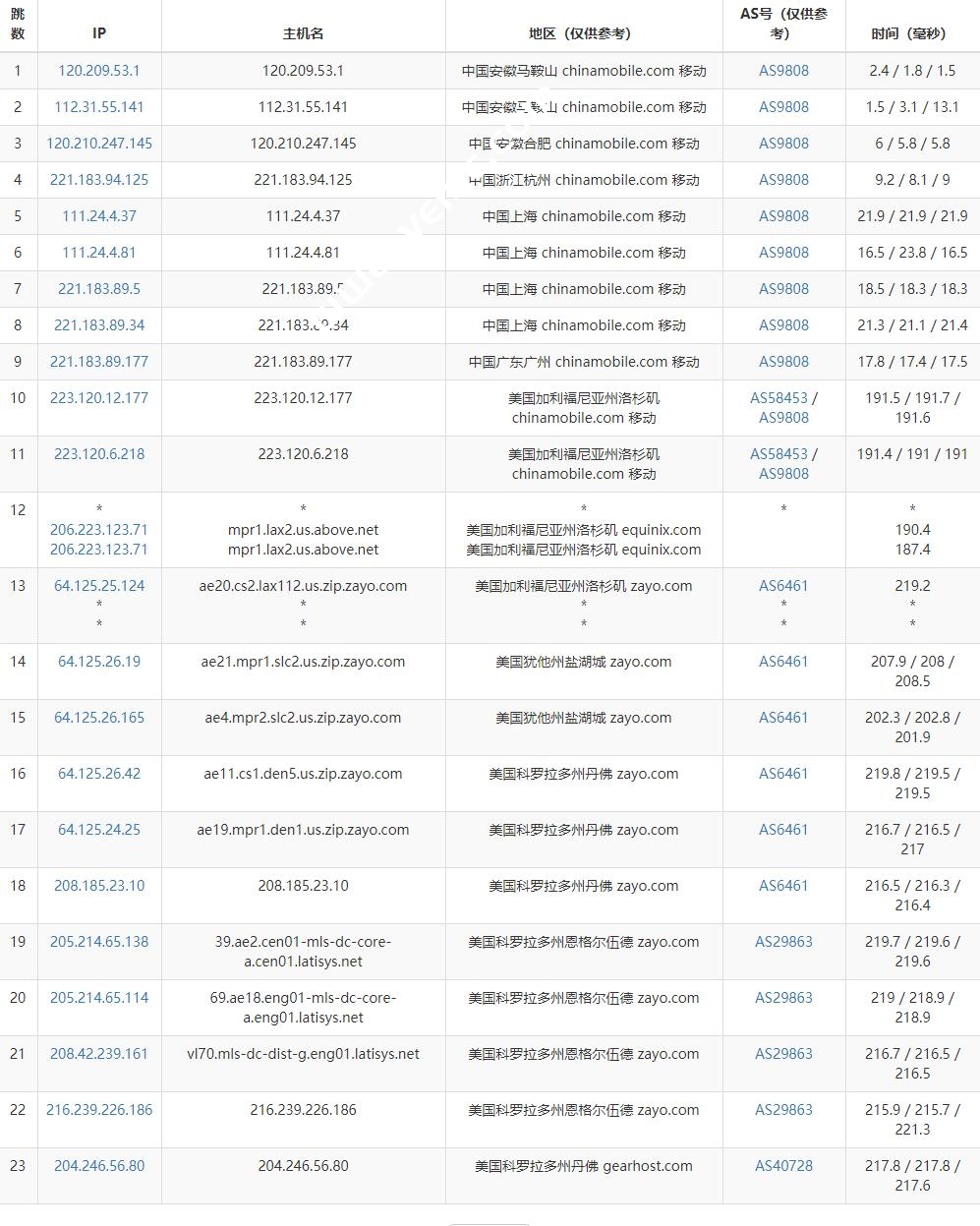 移动-zayo的链路在北美本土并不常见,大多都顺延至亚洲了,zayo到移动也是一个免费的互联而已,使用互联点是在洛杉矶,目前仅见到在gear host的免费主机的服务器。以下是CMNET-CMI-zayo的去程链路: