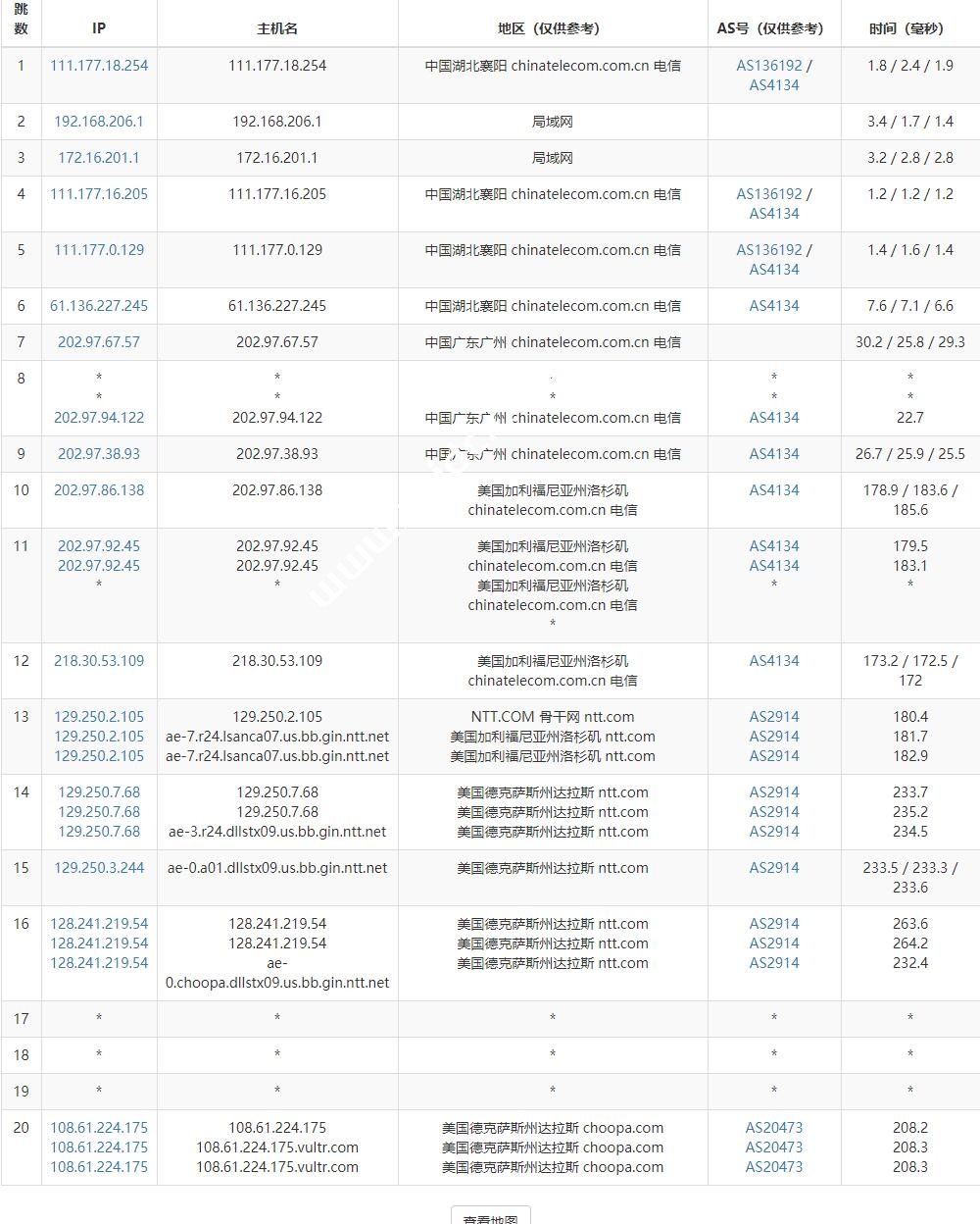 NTT是一个亚洲的运营商,运营公司是在日本,不过由于其与电信在北美也有互联点,所以这里拿到北美也提一下。NTT和电信在北美的互联也是免费PEER,互联点在洛杉矶,容量不是很大的样子。。。不过承载的业务也比较少啦。。。目前看到经常走ntt的基本只有colocrossing和choopa的部分地域。一下是电信-北美NTT的去程路由:
