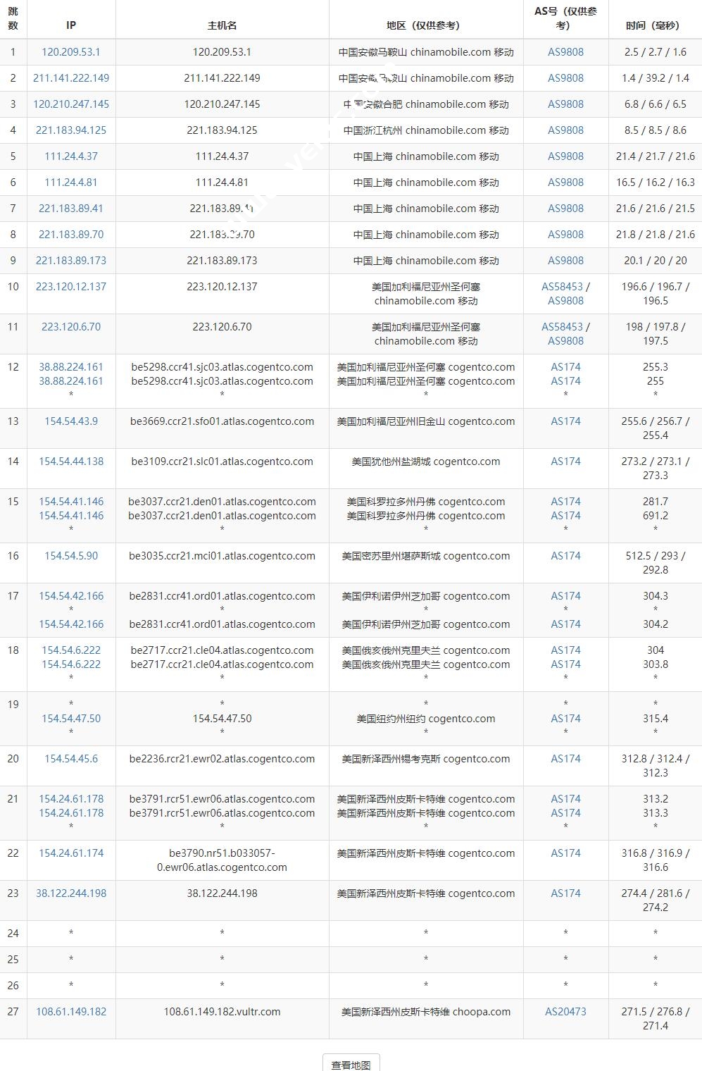 cogent在北美基本全都是万人骑的线路,到移动也是这样,基本上北美没接移动的都从cogent走,互联容量还不足。cogent和移动的互联点在洛杉矶和圣何塞,如下是一条CMNET-CMI-cogent的链路: