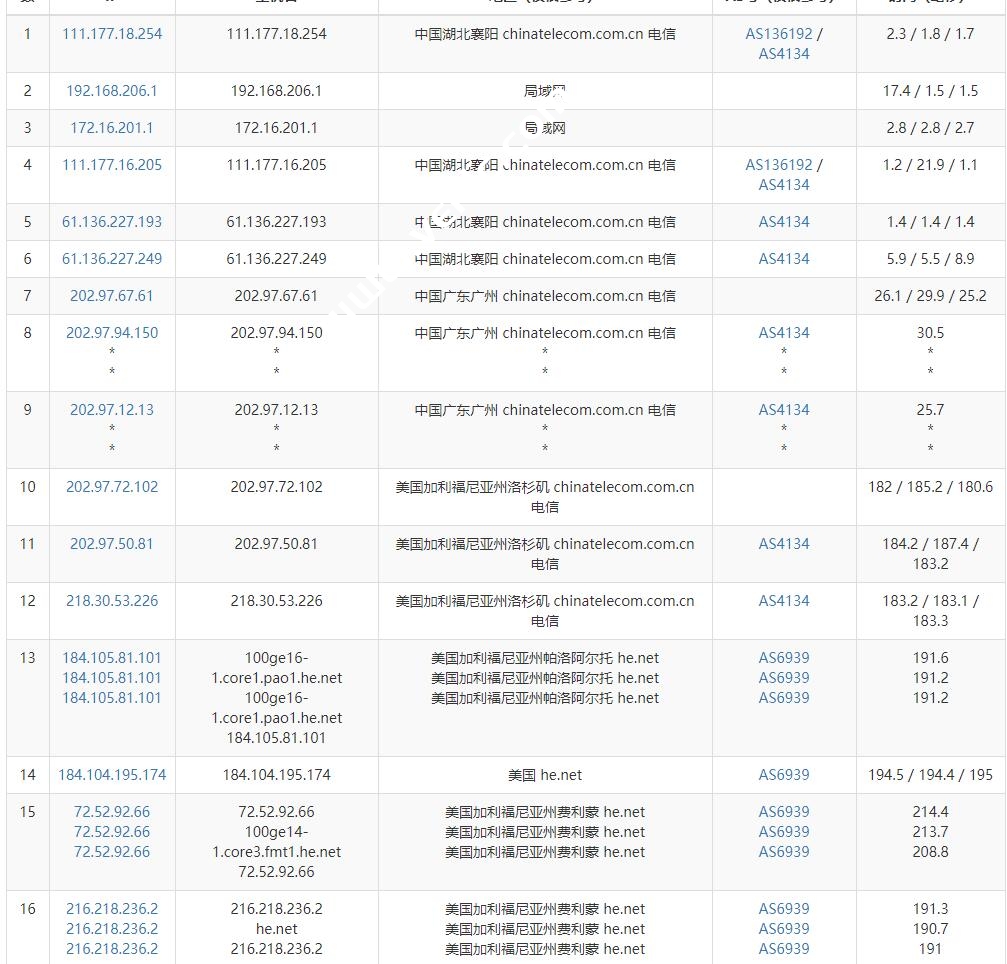 he作为全球另一大T1运营商,基本情况是与cogent类似的,he和电信的互联点也是在洛杉矶和圣何塞,但互联容量相比cogent来说是小得多,所以不难猜想。。。he和电信的互联相比cogent来说要炸的更厉害一点。。。如下就是电信-he的去程路由: