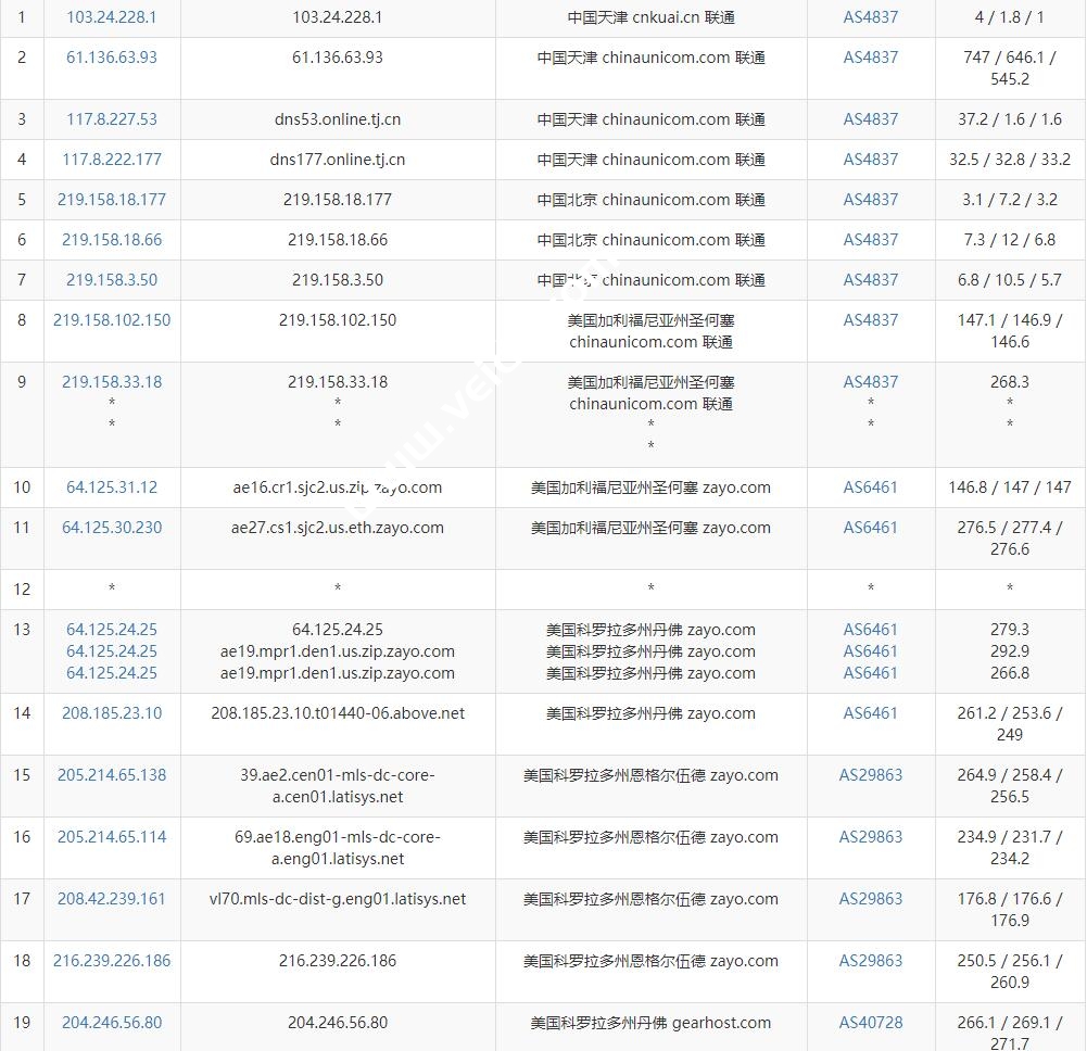 联通-zayo的链路在北美本土并不常见,大多都顺延至亚洲了,zayo到联通也是一个免费的互联而已,使用链路是北京-圣何塞,目前仅见到在gear host的免费主机的服务器。以下是北京-zayo的去程链路: