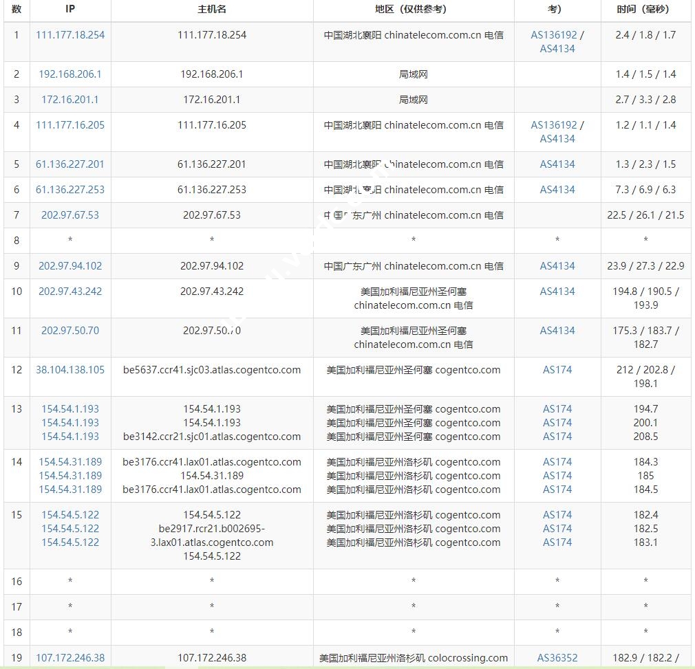 北美GTT是联通经常走的路线,对于电信来说,它的存在感也是比较低的,仍然是免费PEER,质量平平,互联点在圣何塞,目前看到经常走gtt的基本只有colocrossing和choopa的部分地域。以下是电信-GTT的去程路由: