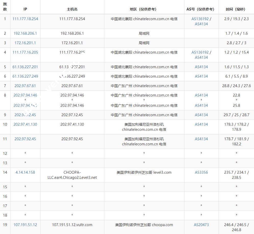 Level3是目前电信的唯一一个transit互联了,电信出钱靠Level3承载部分互联业务,互联点在洛杉矶。不过目前这条线路也并不常用了,只在北美做部分备用和冗余,还是只看到了choopa部分地域走了Level3.(说句题外话,电信在欧洲CF走的那部分Level3并不是电信购买的transit,而是CF买的。)以下是电信-Level3的去程路由: