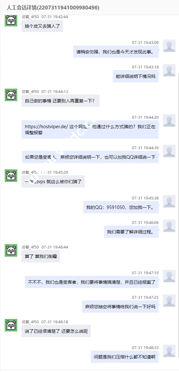 博鳌云与受害者聊天时也能发现,显然也将博鳌云当做是跑路商家了。客户虽然不愿意说,但从中还是能看到,客户购买了一年VPS,现在没得用了。说换了个皮又去骗人了。