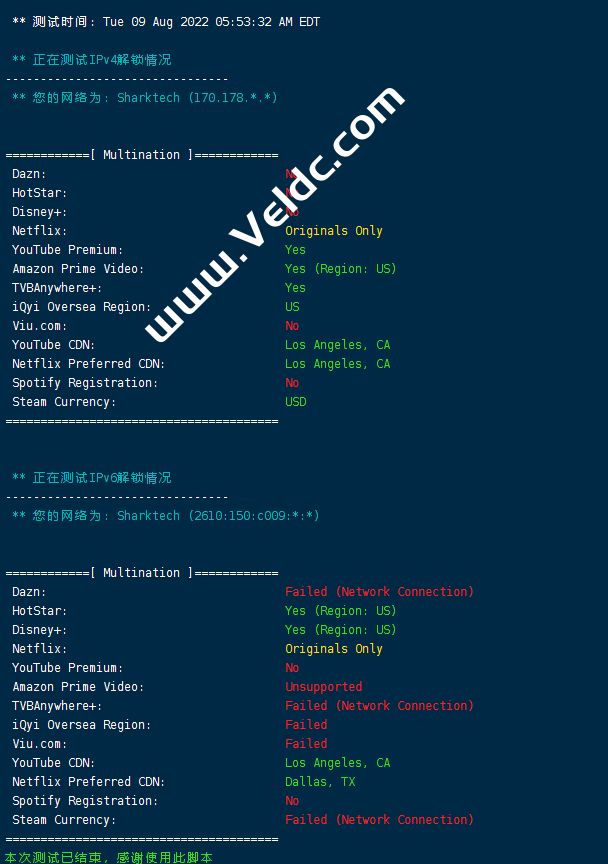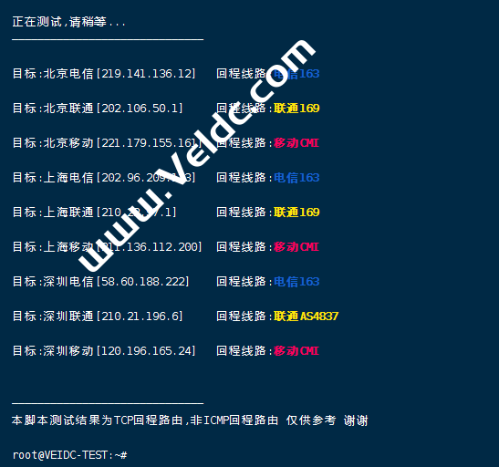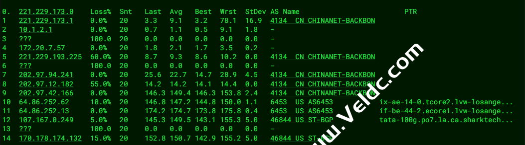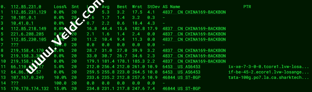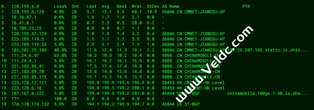 [Info] 测试路由 到 上海电信(天翼云) 中 ... traceroute to 101.227.255.45 (101.227.255.45), 30 hops max, 32 byte packets 1 customer.sharktech.net (104.160.190.1) 1.02 ms AS46844 United States, California, Los Angeles, sharktech.net 2 10.0.0.21 0.78 ms * LAN Address 3 ae18.cr4-lax2.ip4.gtt.net (69.174.10.217) 0.43 ms AS3257 United States, California, Los Angeles, gtt.net 4 ae9.cr3-lax2.ip4.gtt.net (89.149.141.105) 0.39 ms AS3257 United States, California, Los Angeles, gtt.net 5 218.30.54.72 1.58 ms AS4134 United States, California, Los Angeles, ChinaTelecom 6 * 7 202.97.90.30 181.59 ms AS4134 China, Shanghai, ChinaTelecom 8 202.97.50.137 159.41 ms AS4134 China, Shanghai, ChinaTelecom 9 61.152.24.53 170.49 ms AS4812 China, Shanghai, ChinaTelecom 10 101.95.207.6 174.48 ms AS4812 China, Shanghai, ChinaTelecom 11 * 12 * 13 * 14 * 15 * 16 * 17 * 18 * 19 * 20 * 21 * 22 * 23 * 24 * 25 * 26 * 27 * 28 * 29 * 30 * [Info] 测试路由 到 上海电信(天翼云) 完成 ! [Info] 测试路由 到 厦门电信CN2 中 ... traceroute to 117.28.254.129 (117.28.254.129), 30 hops max, 32 byte packets 1 customer.sharktech.net (104.160.190.1) 0.98 ms AS46844 United States, California, Los Angeles, sharktech.net 2 10.0.0.21 0.64 ms * LAN Address 3 be-125-pe11.losangeles.ca.ibone.comcast.net (173.167.58.193) 1.47 ms AS7922 United States, California, Los Angeles, comcast.com 4 lag-24.ear2.LosAngeles1.Level3.net (4.68.73.193) 0.34 ms AS3356 United States, California, Los Angeles, level3.com 5 CHINA-TELEC.ear2.LosAngeles1.Level3.net (4.71.136.202) 1.06 ms AS3356 United States, California, Los Angeles, level3.com 6 59.43.184.157 155.55 ms * China, Shanghai, ChinaTelecom 7 * 8 59.43.130.217 157.06 ms * China, Shanghai, ChinaTelecom 9 59.43.138.186 158.80 ms * China, Fujian, ChinaTelecom 10 * 11 * 12 * 13 * 14 117.28.254.129 159.09 ms AS4809 China, Fujian, Xiamen, ChinaTelecom [Info] 测试路由 到 厦门电信CN2 完成 ! [Info] 测试路由 到 浙江杭州联通 中 ... traceroute to 101.71.241.238 (101.71.241.238), 30 hops max, 32 byte packets 1 customer.sharktech.net (104.160.190.1) 0.83 ms AS46844 United States, California, Los Angeles, sharktech.net 2 10.0.0.21 0.95 ms * LAN Address 3 be-125-pe11.losangeles.ca.ibone.comcast.net (173.167.58.193) 1.72 ms AS7922 United States, California, Los Angeles, comcast.com 4 be-2411-cs04.losangeles.ca.ibone.comcast.net (96.110.33.13) 1.45 ms AS7922 United States, California, Los Angeles, comcast.com 5 be-2401-pe01.losangeles.ca.ibone.comcast.net (96.110.44.110) 0.96 ms AS7922 United States, California, Los Angeles, comcast.com 6 219.158.40.121 57.21 ms AS4837 United States, California, Los Angeles, ChinaUnicom 7 219.158.98.149 205.91 ms AS4837 China, Guangdong, Guangzhou, ChinaUnicom 8 219.158.97.26 182.04 ms AS4837 China, Guangdong, Guangzhou, ChinaUnicom 9 219.158.24.125 201.57 ms AS4837 China, Guangdong, Guangzhou, ChinaUnicom 10 * 11 * 12 * 13 * 14 * 15 * 16 * 17 * 18 * 19 * 20 * 21 * 22 * 23 * 24 * 25 * 26 * 27 * 28 * 29 * 30 * [Info] 测试路由 到 浙江杭州联通 完成 ! [Info] 测试路由 到 浙江杭州移动 中 ... traceroute to 112.17.0.106 (112.17.0.106), 30 hops max, 32 byte packets 1 customer.sharktech.net (104.160.190.1) 1.45 ms AS46844 United States, California, Los Angeles, sharktech.net 2 10.0.0.21 0.68 ms * LAN Address 3 223.119.64.253 0.77 ms AS58453 United States, ChinaMobile 4 223.120.6.22 1.00 ms AS58453 United States, California, Los Angeles, ChinaMobile 5 223.120.12.18 172.32 ms AS58453 China, Shanghai, ChinaMobile 6 221.183.55.46 196.68 ms AS9808 China, Shanghai, ChinaMobile 7 221.183.25.189 214.57 ms AS9808 China, Shanghai, ChinaMobile 8 221.176.22.9 181.13 ms AS9808 China, Shanghai, ChinaMobile 9 111.24.3.89 180.64 ms AS9808 China, Shanghai, ChinaMobile 10 111.24.3.30 212.94 ms AS9808 China, Zhejiang, Hangzhou, ChinaMobile 11 * 12 218.205.59.226 201.88 ms AS56041 China, Zhejiang, Hangzhou, ChinaMobile 13 * 14 * 15 * 16 * 17 * 18 * 19 * 20 * 21 * 22 * 23 * 24 * 25 * 26 * 27 * 28 * 29 * 30 * [Info] 测试路由 到 浙江杭州移动 完成 ! [Info] 测试路由 到 北京教育网 中 ... traceroute to 202.205.6.30 (202.205.6.30), 30 hops max, 32 byte packets 1 customer.sharktech.net (104.160.190.1) 0.67 ms AS46844 United States, California, Los Angeles, sharktech.net 2 10.0.0.21 0.68 ms * LAN Address 3 * 4 38.88.196.186 3.69 ms AS174 United States, California, Los Angeles, cogentco.com 5 101.4.117.169 178.21 ms AS4538 China, Beijing, CHINAEDU 6 * 7 101.4.118.213 161.20 ms AS4538 China, Beijing, CHINAEDU 8 101.4.113.110 160.59 ms AS4538 China, Beijing, CHINAEDU 9 219.224.102.230 161.63 ms AS4538 China, Beijing, CHINAEDU 10 * 11 * 12 * 13 * 14 101.4.130.54 161.76 ms AS4538 China, Beijing, CHINAEDU 15 * 16 * 17 * 18 * 19 * 20 * 21 * 22 * 23 * 24 101.4.130.54 162.19 ms AS4538 China, Beijing, CHINAEDU 25 * 26 * 27 101.4.130.53 162.12 ms AS4538 China, Beijing, CHINAEDU 28 * 29 * 30 * [Info] 测试路由 到 北京教育网 完成 ! [Info] 四网路由快速测试 已完成 !
