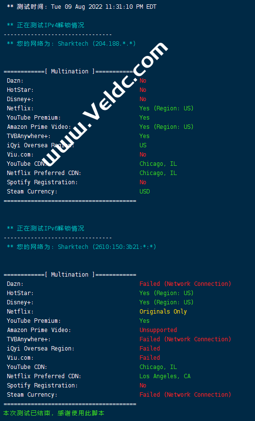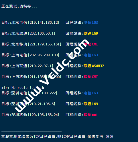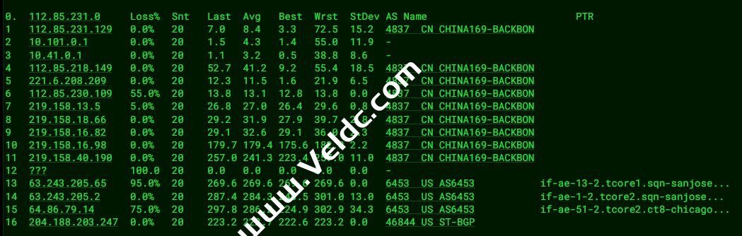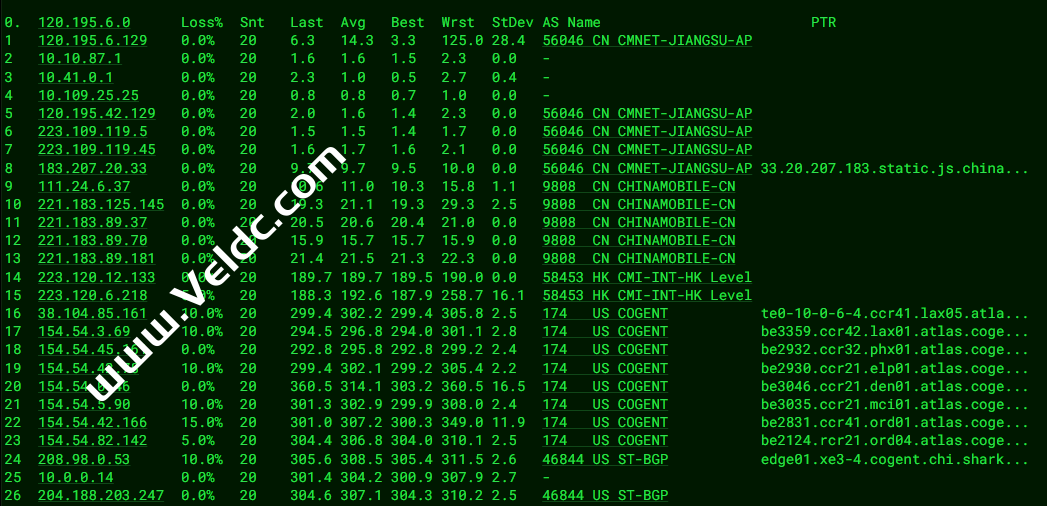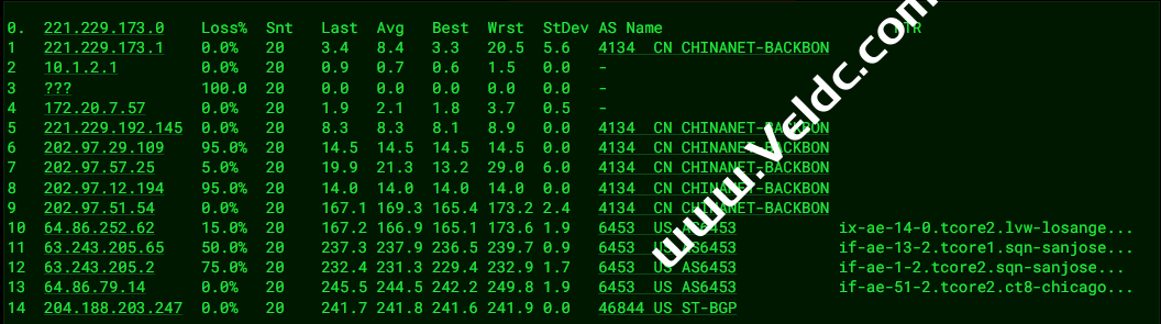 [Info] 测试路由 到 上海电信(天翼云) 中 ... traceroute to 101.227.255.45 (101.227.255.45), 30 hops max, 32 byte packets 1 204.188.203.1 0.81 ms AS46844 United States, Illinois, Chicago, sharktech.net 2 10.0.0.13 0.80 ms * LAN Address 3 be-106-pe11.350ecermak.il.ibone.comcast.net (50.208.232.193) 65.31 ms AS7922 United States, Illinois, Chicago, comcast.com 4 be-2211-cs02.350ecermak.il.ibone.comcast.net (96.110.33.197) 2.62 ms AS7922 United States, Illinois, Chicago, comcast.com 5 be-1212-cr12.350ecermak.il.ibone.comcast.net (96.110.35.22) 1.32 ms AS7922 United States, Illinois, Chicago, comcast.com 6 be-302-cr11.newyork.ny.ibone.comcast.net (96.110.38.70) 17.90 ms AS7922 United States, New York, New York City, comcast.com 7 be-1411-cs04.newyork.ny.ibone.comcast.net (96.110.35.125) 18.76 ms AS7922 United States, New York, New York City, comcast.com 8 be-4401-pe01.60hudson.ny.ibone.comcast.net (96.110.41.158) 18.17 ms AS7922 United States, New York, New York City, comcast.com 9 as2906-c-2.dallas.ibone.comcast.net (50.242.149.58) 24.08 ms AS7922 United States, New York, New York City, comcast.com 10 202.97.98.189 63.92 ms AS4134 United States, California, San Jose, ChinaTelecom 11 * 12 202.97.33.125 196.82 ms AS4134 China, Shanghai, ChinaTelecom 13 * 14 61.152.26.41 195.28 ms AS4812 China, Shanghai, ChinaTelecom 15 * 16 * 17 * 18 * 19 * 20 * 21 * 22 * 23 * 24 * 25 * 26 * 27 * 28 * 29 * 30 * [Info] 测试路由 到 上海电信(天翼云) 完成 ! [Info] 测试路由 到 厦门电信CN2 中 ... traceroute to 117.28.254.129 (117.28.254.129), 30 hops max, 32 byte packets 1 204.188.203.1 0.74 ms AS46844 United States, Illinois, Chicago, sharktech.net 2 10.0.0.5 0.74 ms * LAN Address 3 * 4 be2125.ccr42.ord01.atlas.cogentco.com (154.54.82.201) 0.95 ms AS174 United States, Illinois, Chicago, cogentco.com 5 be2766.ccr41.ord03.atlas.cogentco.com (154.54.46.178) 1.02 ms AS174 United States, Illinois, Chicago, cogentco.com 6 telia.ord03.atlas.cogentco.com (154.54.12.38) 0.84 ms AS174 United States, Illinois, Chicago, cogentco.com 7 kanc-b2-link.ip.twelve99.net (213.155.130.177) 12.55 ms AS1299 United States, Missouri, Kansas City, telia.com 8 sjo-b23-link.ip.twelve99.net (62.115.121.176) 48.37 ms AS1299 United States, California, San Jose, telia.com 9 sjo-b1-link.ip.twelve99.net (62.115.125.161) 48.42 ms AS1299 United States, California, San Jose, telia.com 10 chinatelecom-ic307264-sjo-b21.ip.twelve99-cust.net (80.239.132.158) 48.49 ms AS1299 United States, California, San Jose, telia.com 11 59.43.182.85 194.98 ms * China, Shanghai, ChinaTelecom 12 59.43.187.69 194.82 ms * China, Shanghai, ChinaTelecom 13 59.43.130.205 201.57 ms * China, Shanghai, ChinaTelecom 14 59.43.138.186 199.80 ms * China, Fujian, ChinaTelecom 15 * 16 * 17 * 18 * 19 117.28.254.129 199.49 ms AS4809 China, Fujian, Xiamen, ChinaTelecom [Info] 测试路由 到 厦门电信CN2 完成 ! [Info] 测试路由 到 浙江杭州联通 中 ... traceroute to 101.71.241.238 (101.71.241.238), 30 hops max, 32 byte packets 1 204.188.203.1 0.75 ms AS46844 United States, Illinois, Chicago, sharktech.net 2 10.0.0.5 0.63 ms * LAN Address 3 be-106-pe11.350ecermak.il.ibone.comcast.net (50.208.232.193) 1.06 ms AS7922 United States, Illinois, Chicago, comcast.com 4 be-2211-cs02.350ecermak.il.ibone.comcast.net (96.110.33.197) 0.85 ms AS7922 United States, Illinois, Chicago, comcast.com 5 be-1211-cr11.350ecermak.il.ibone.comcast.net (96.110.35.6) 1.00 ms AS7922 United States, Illinois, Chicago, comcast.com 6 be-304-cr11.1601milehigh.co.ibone.comcast.net (96.110.37.158) 23.72 ms AS7922 United States, Colorado, Denver, comcast.com 7 be-1211-cs02.1601milehigh.co.ibone.comcast.net (96.110.39.69) 24.11 ms AS7922 United States, Colorado, Denver, comcast.com 8 * 9 be-301-cr14.champa.co.ibone.comcast.net (96.110.39.1) 24.04 ms AS7922 United States, Colorado, Denver, comcast.com 10 be-1414-cs04.champa.co.ibone.comcast.net (96.110.37.253) 23.86 ms AS7922 United States, Colorado, Denver, comcast.com 11 be-1412-cr12.champa.co.ibone.comcast.net (96.110.37.222) 24.19 ms AS7922 United States, Colorado, Denver, comcast.com 12 be-303-cr11.sunnyvale.ca.ibone.comcast.net (96.110.39.26) 48.32 ms AS7922 United States, California, Sunnyvale, comcast.com 13 be-1411-cs04.sunnyvale.ca.ibone.comcast.net (96.110.46.37) 48.28 ms AS7922 United States, California, Sunnyvale, comcast.com 14 be-1412-cr12.sunnyvale.ca.ibone.comcast.net (96.110.46.42) 48.31 ms AS7922 United States, California, Sunnyvale, comcast.com 15 be-301-cr12.9greatoaks.ca.ibone.comcast.net (96.110.37.170) 48.31 ms AS7922 United States, California, San Jose, comcast.com 16 be-1112-cs01.9greatoaks.ca.ibone.comcast.net (68.86.166.133) 49.07 ms AS7922 United States, California, San Jose, comcast.com 17 be-2101-pe01.9greatoaks.ca.ibone.comcast.net (96.110.36.218) 48.67 ms AS7922 United States, California, San Jose, comcast.com 18 as4837-pe01.11greatoaks.ca.ibone.comcast.net (75.149.229.42) 47.47 ms AS7922 United States, California, San Jose, comcast.com 19 219.158.98.9 198.73 ms AS4837 China, Beijing, ChinaUnicom 20 219.158.111.218 219.03 ms AS4837 China, Shanghai, ChinaUnicom 21 219.158.19.74 224.24 ms AS4837 China, Shanghai, ChinaUnicom 22 219.158.19.81 215.43 ms AS4837 China, Shanghai, ChinaUnicom 23 219.158.115.146 239.88 ms AS4837 China, Zhejiang, Hangzhou, ChinaUnicom 24 * 25 * 26 * 27 * 28 * 29 * 30 * [Info] 测试路由 到 浙江杭州联通 完成 ! [Info] 测试路由 到 浙江杭州移动 中 ... traceroute to 112.17.0.106 (112.17.0.106), 30 hops max, 32 byte packets 1 204.188.203.1 1.16 ms AS46844 United States, Illinois, Chicago, sharktech.net 2 10.0.0.5 0.68 ms * LAN Address 3 * 4 be2125.ccr42.ord01.atlas.cogentco.com (154.54.82.201) 1.17 ms AS174 United States, Illinois, Chicago, cogentco.com 5 be2832.ccr22.mci01.atlas.cogentco.com (154.54.44.169) 12.81 ms AS174 United States, Missouri, Kansas City, cogentco.com 6 be3036.ccr22.den01.atlas.cogentco.com (154.54.31.89) 24.06 ms AS174 United State