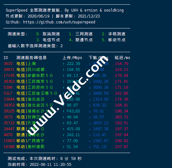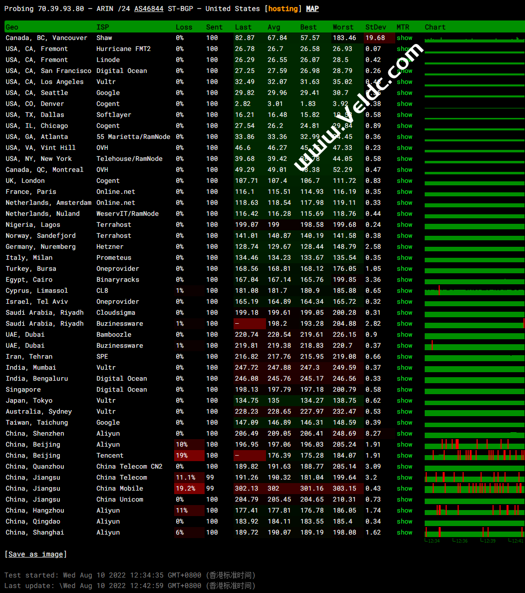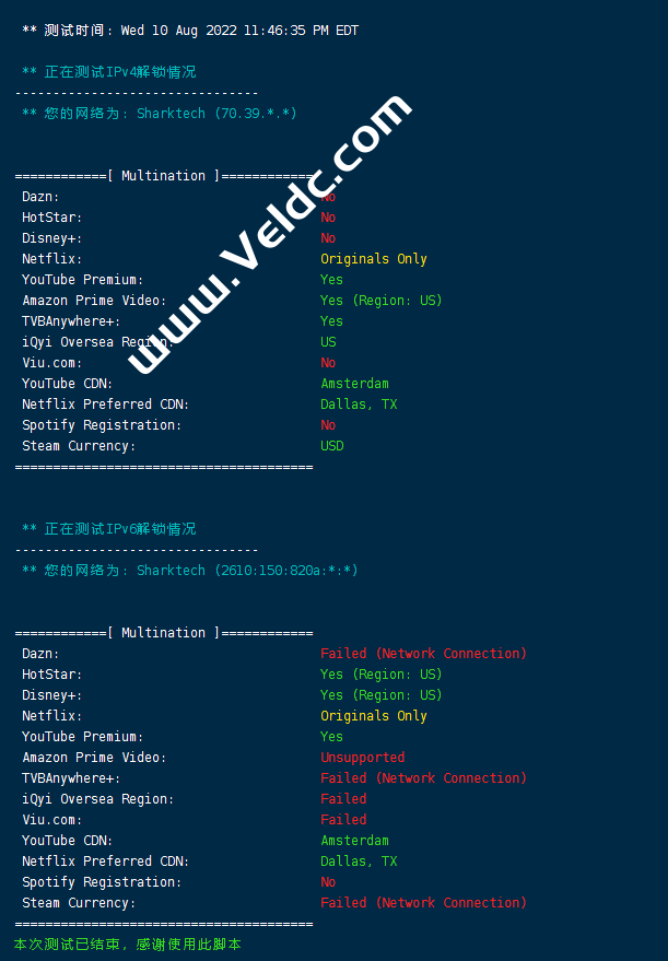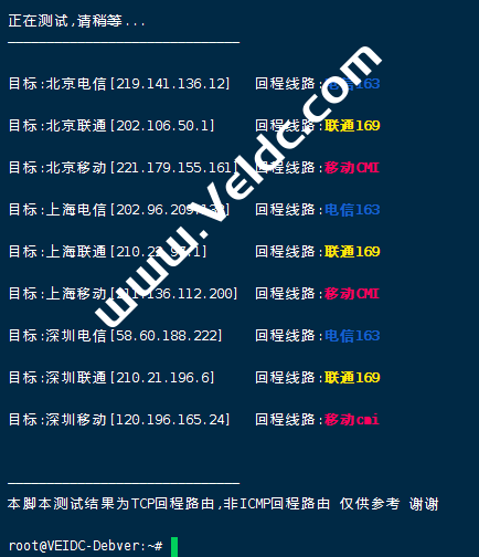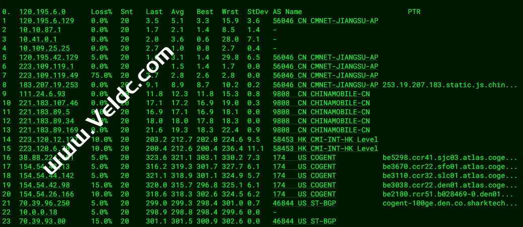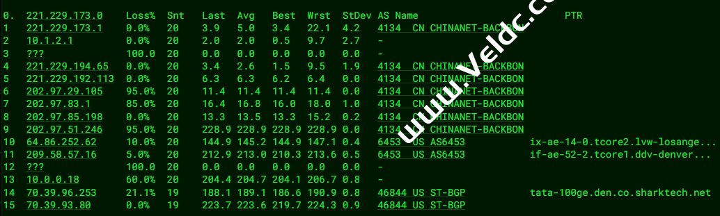 [Info] 测试路由 到 上海电信(天翼云) 中 ... traceroute to 101.227.255.45 (101.227.255.45), 30 hops max, 32 byte packets 1 198.148.92.1 1.05 ms AS46844 United States, Colorado, Denver, sharktech.net 2 10.0.0.5 0.77 ms * LAN Address 3 38.32.93.1 0.58 ms AS174 United States, Colorado, Denver, cogentco.com 4 be2180.ccr22.den01.atlas.cogentco.com (154.54.26.165) 2.61 ms AS174 United States, Colorado, Denver, cogentco.com 5 be3038.ccr32.slc01.atlas.cogentco.com (154.54.42.97) 12.12 ms AS174 United States, Utah, Salt Lake City, cogentco.com 6 be3110.ccr22.sfo01.atlas.cogentco.com (154.54.44.141) 27.06 ms AS174 United States, California, San Francisco, cogentco.com 7 be3670.ccr41.sjc03.atlas.cogentco.com (154.54.43.14) 28.29 ms AS174 United States, California, San Jose, cogentco.com 8 * 9 202.97.89.134 167.81 ms AS4134 China, Shanghai, ChinaTelecom 10 * 11 * 12 61.152.25.37 171.71 ms AS4812 China, Shanghai, ChinaTelecom 13 * 14 * 15 * 16 * 17 * 18 * 19 * 20 * 21 * 22 * 23 * 24 * 25 * 26 * 27 * 28 * 29 * 30 * [Info] 测试路由 到 上海电信(天翼云) 完成 ! [Info] 测试路由 到 厦门电信CN2 中 ... traceroute to 117.28.254.129 (117.28.254.129), 30 hops max, 32 byte packets 1 198.148.92.1 1.44 ms AS46844 United States, Colorado, Denver, sharktech.net 2 10.0.0.17 0.77 ms * LAN Address 3 be-104-pe12.910fifteenth.co.ibone.comcast.net (66.208.228.181) 1.22 ms AS7922 United States, Colorado, Denver, comcast.com 4 4.68.74.13 1.82 ms AS3356 United States, Colorado, Denver, level3.com 5 * 6 CHINA-TELEC.ear2.LosAngeles1.Level3.net (4.71.136.202) 36.28 ms AS3356 United States, California, Los Angeles, level3.com 7 59.43.182.81 187.38 ms * China, Shanghai, ChinaTelecom 8 * 9 59.43.130.205 191.20 ms * China, Shanghai, ChinaTelecom 10 59.43.138.186 200.96 ms * China, Fujian, ChinaTelecom 11 * 12 * 13 * 14 * 15 117.28.254.129 190.53 ms AS4809 China, Fujian, Xiamen, ChinaTelecom [Info] 测试路由 到 厦门电信CN2 完成 ! [Info] 测试路由 到 浙江杭州联通 中 ... traceroute to 101.71.241.238 (101.71.241.238), 30 hops max, 32 byte packets 1 198.148.92.1 0.85 ms AS46844 United States, Colorado, Denver, sharktech.net 2 10.0.0.5 0.78 ms * LAN Address 3 be-104-pe12.910fifteenth.co.ibone.comcast.net (66.208.228.181) 1.32 ms AS7922 United States, Colorado, Denver, comcast.com 4 be-3312-cs03.champa.co.ibone.comcast.net (96.110.33.137) 1.68 ms AS7922 United States, Colorado, Denver, comcast.com 5 be-1312-cr12.champa.co.ibone.comcast.net (96.110.37.218) 1.36 ms AS7922 United States, Colorado, Denver, comcast.com 6 be-303-cr11.sunnyvale.ca.ibone.comcast.net (96.110.39.26) 26.55 ms AS7922 United States, California, Sunnyvale, comcast.com 7 be-1411-cs04.sunnyvale.ca.ibone.comcast.net (96.110.46.37) 26.61 ms AS7922 United States, California, Sunnyvale, comcast.com 8 be-1412-cr12.sunnyvale.ca.ibone.comcast.net (96.110.46.42) 25.97 ms AS7922 United States, California, Sunnyvale, comcast.com 9 be-303-cr12.9greatoaks.ca.ibone.comcast.net (96.110.37.178) 26.11 ms AS7922 United States, California, San Jose, comcast.com 10 be-1312-cs03.9greatoaks.ca.ibone.comcast.net (68.86.166.157) 26.78 ms AS7922 United States, California, San Jose, comcast.com 11 be-2301-pe01.9greatoaks.ca.ibone.comcast.net (96.110.36.226) 26.37 ms AS7922 United States, California, San Jose, comcast.com 12 as4837-pe01.11greatoaks.ca.ibone.comcast.net (75.149.229.42) 28.82 ms AS7922 United States, California, San Jose, comcast.com 13 * 14 219.158.111.218 302.90 ms AS4837 China, Shanghai, ChinaUnicom 15 * 16 * 17 * 18 * 19 * 20 * 21 * 22 * 23 * 24 * 25 * 26 * 27 * 28 * 29 * 30 * [Info] 测试路由 到 浙江杭州联通 完成 ! [Info] 测试路由 到 浙江杭州移动 中 ... traceroute to 112.17.0.106 (112.17.0.106), 30 hops max, 32 byte packets 1 198.148.92.1 1.01 ms AS46844 United States, Colorado, Denver, sharktech.net 2 10.0.0.17 0.73 ms * LAN Address 3 38.32.94.9 0.67 ms AS174 United States, Colorado, Denver, cogentco.com 4 be2180.ccr22.den01.atlas.cogentco.com (154.54.26.165) 1.91 ms AS174 United States, Colorado, Denver, cogentco.com 5 be3047.ccr21.elp01.atlas.cogentco.com (154.54.1.125) 14.68 ms AS174 United States, Texas, El Paso, cogentco.com 6 be2929.ccr31.phx01.atlas.cogentco.com (154.54.42.65) 23.01 ms AS174 United States, Arizona, Phoenix, cogentco.com 7 be2931.ccr41.lax01.atlas.cogentco.com (154.54.44.86) 35.73 ms AS174 United States, California, Los Angeles, cogentco.com 8 be3243.ccr41.lax05.atlas.cogentco.com (154.54.27.118) 34.72 ms AS174 United States, California, Los Angeles, cogentco.com 9 * 10 223.120.6.217 98.71 ms AS58453 United States, California, Los Angeles, ChinaMobile 11 * 12 * 13 * 14 221.176.22.33 273.60 ms AS9808 China, Shanghai, ChinaMobile 15 * 16 221.183.109.34 278.98 ms AS9808 China, Zhejiang, Hangzhou, ChinaMobile 17 * 18 * 19 * 20 * 21 * 22 * 23 * 24 * 25 * 26 * 27 * 28 * 29 * 30 * [Info] 测试路由 到 浙江杭州移动 完成 ! [Info] 测试路由 到 北京教育网 中 ... traceroute to 202.205.6.30 (202.205.6.30), 30 hops max, 32 byte packets 1 198.148.92.1 26.96 ms AS46844 United States, Colorado, Denver, sharktech.net 2 10.0.0.17 0.86 ms * LAN Address 3 38.32.93.1 0.59 ms AS174 United States, Colorado, Denver, cogentco.com 4 be2179.ccr21.den01.atlas.cogentco.com (154.54.25.173) 2.57 ms AS174 United States, Colorado, Denver, cogentco.com 5 be3046.ccr21.elp01.atlas.cogentco.com (154.54.0.45) 14.96 ms AS174 United States, Texas, El Paso, cogentco.com 6 be2930.ccr32.phx01.atlas.cogentco.com (154.54.42.77) 24.46 ms AS174 United States, Arizona, Phoenix, cogentco.com 7 be2932.ccr42.lax01.atlas.cogentco.com (154.54.45.162) 35.33 ms AS174 United States, California, Los Angeles, cogentco.com 8 be3360.ccr41.lax04.atlas.cogentco.com (154.54.25.150) 35.09 ms AS174 United States, California, Los Angeles, cogentco.com 9 38.88.196.186 37.19 ms AS174 United States, California, Los Angeles, cogentco.com 10 101.4.117.169 180.26 ms AS4538 China, Beijing, CHINAEDU 11 * 12 101.4.118.213 179.61 