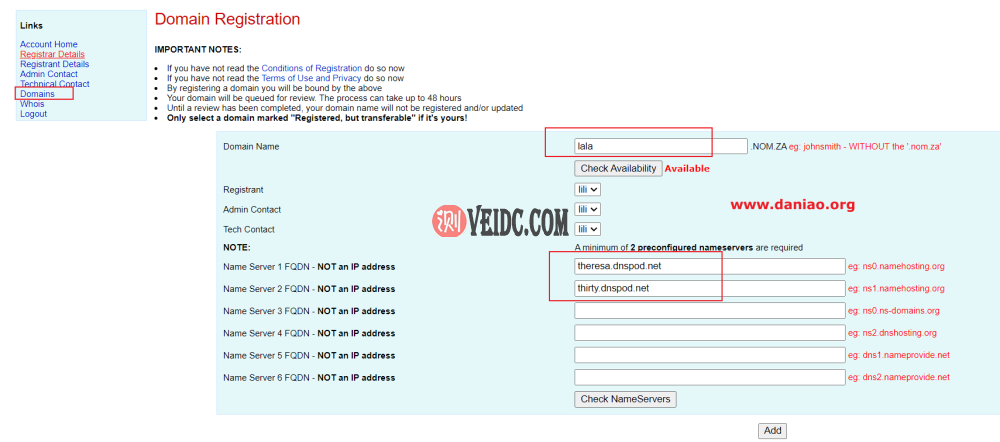 - 如果你需要在Nom.za下注册多个域名,你需要创建不同的“注册人”,以注册人的名义申请开通对应的域名。