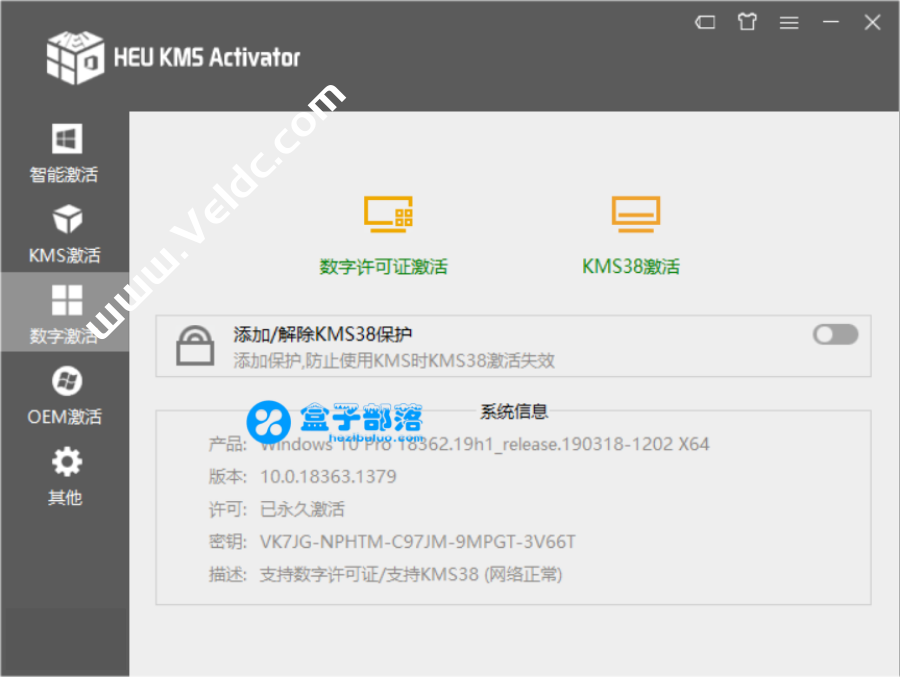 1、数字权利激活:仅支持Windows10(永久激活,与KMS机制无关)。