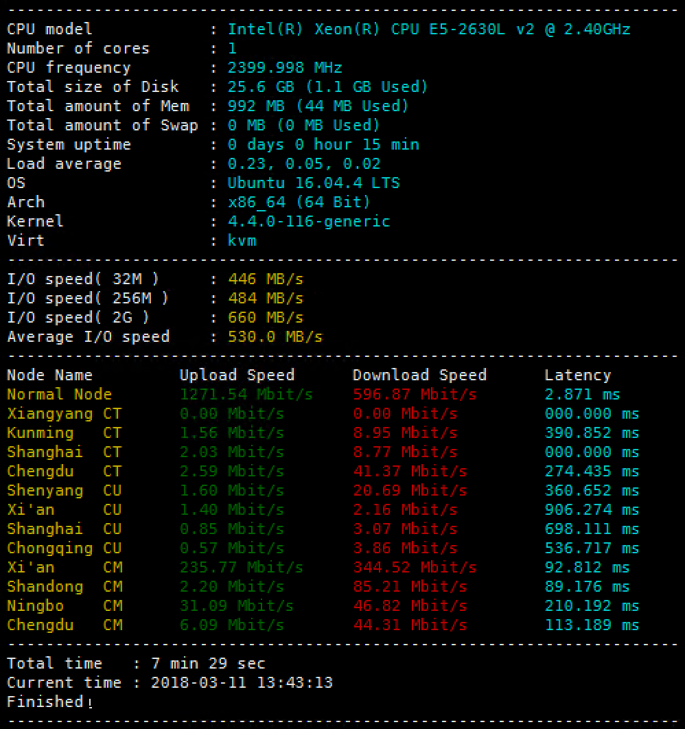 可以看到UnixBench跑分为700+,还是比较好的。IO也很不错。综合测试下来最令我惊喜的是网络,带宽给的非常足,能达到GB级的水平~