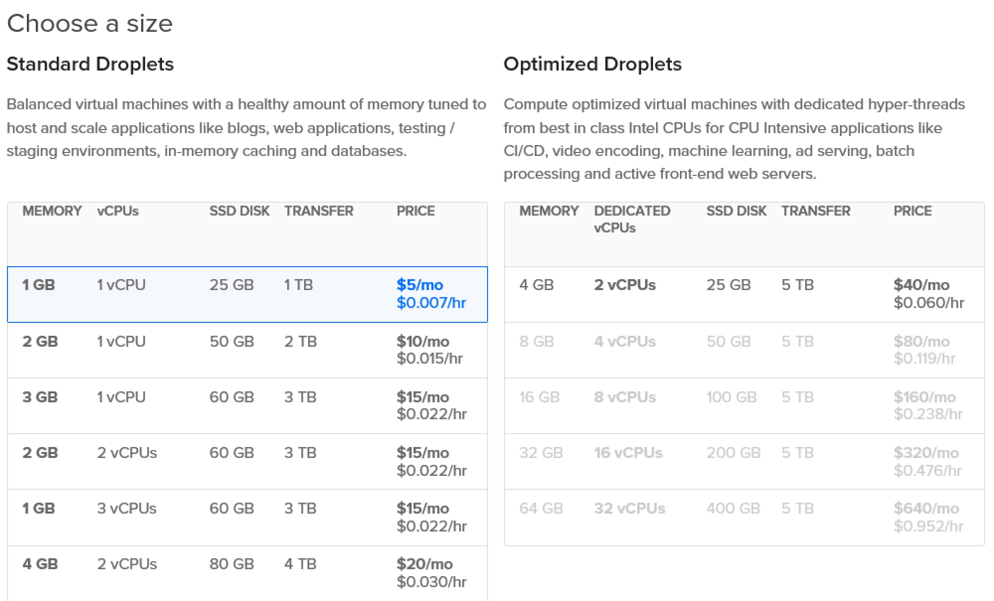 这是DigitalOcean的价格表,最便宜的是5美元一个月。
