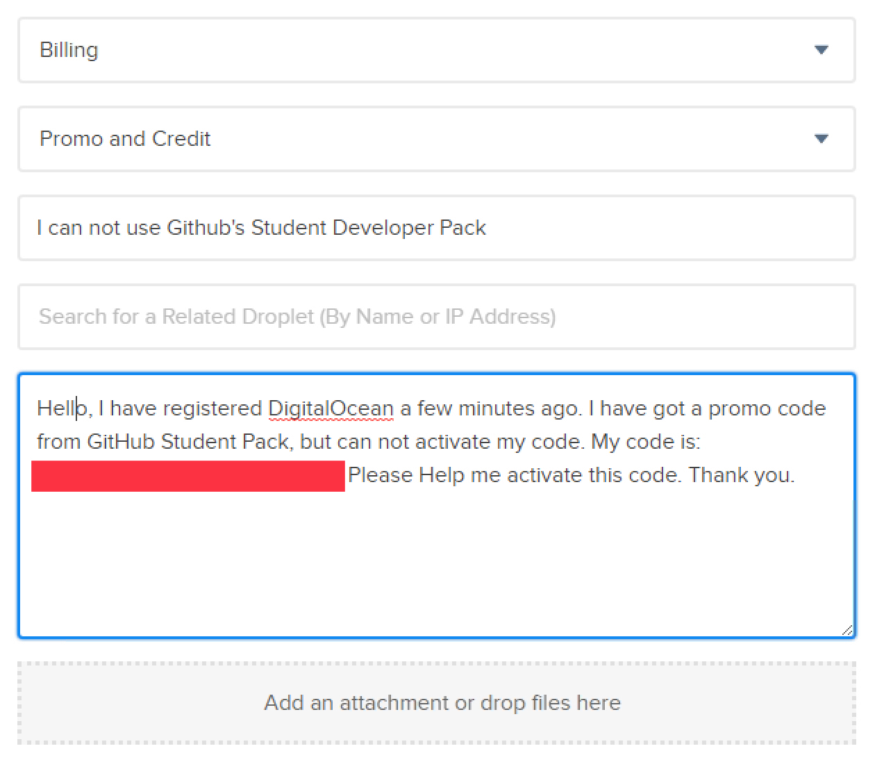 - 一点小Tips 在添加完新用户的10刀代金券后,大部分有GitHub学生包的人都会发现没法再添加50刀优惠券!这时提交个工单,用英语告诉客服你的状况,并在工单里附上你的代金券代码,请求帮忙激活。英文不好的可以参考一下我的写法: