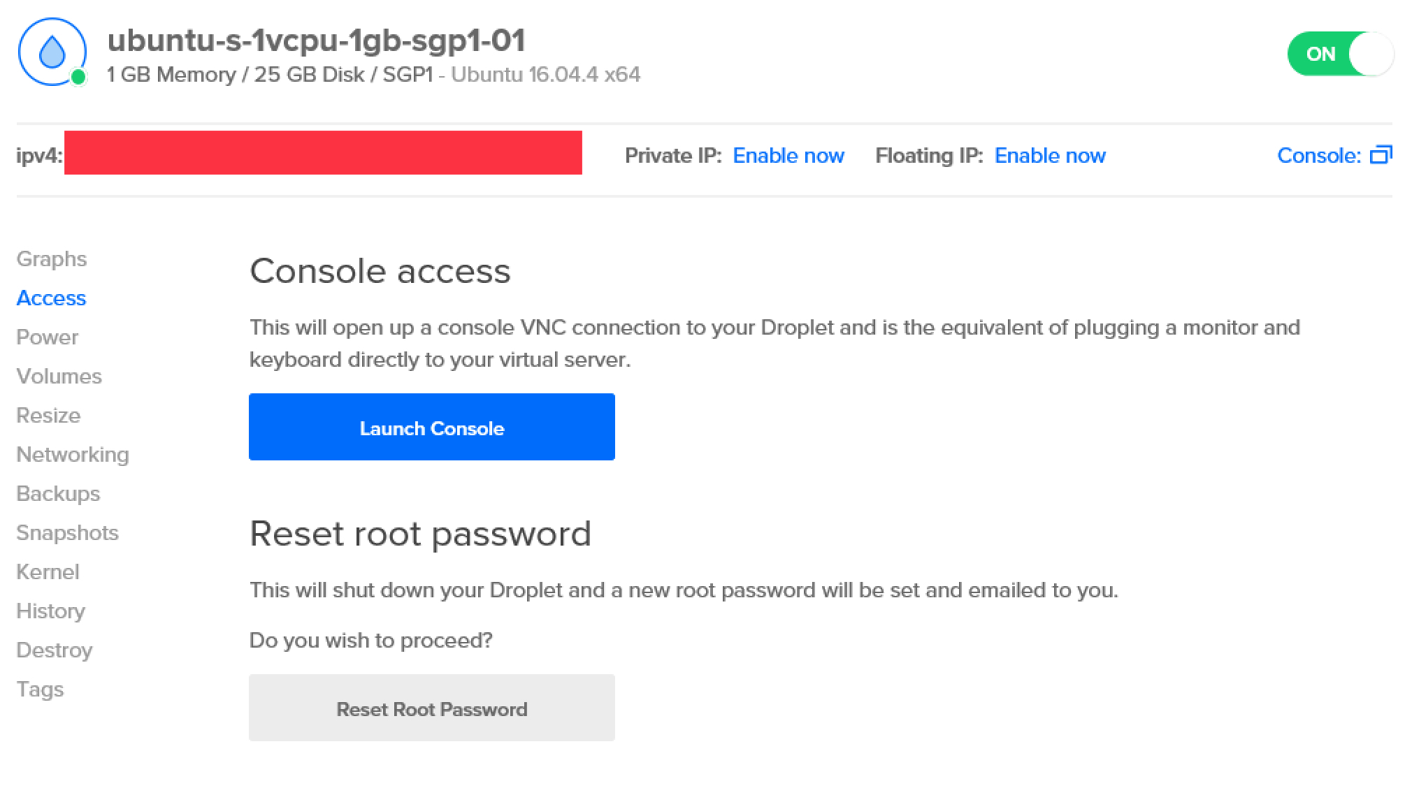 这是DigitalOcean VPS主机管理界面,创建VPS主机后,稍等几分钟就可以看到VPS列表了,这里有删除、升级配置、备份、报表和Web控制台等。