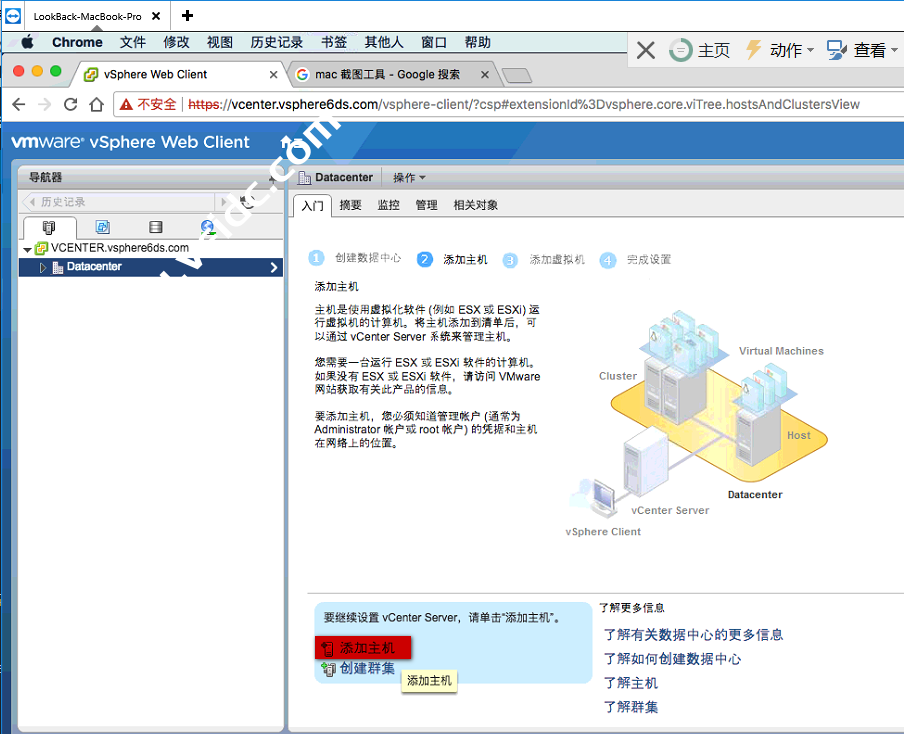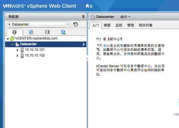 使用相同的办法完成另一台ESXi主机的添加,都完成后将会出现在数据中心DataCenter的清单中,如下图
