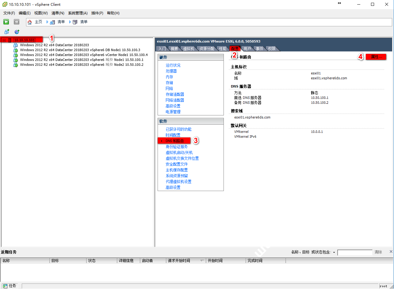 完成后,使用vSphere Client管理客户端分别连接两个ESXi主机,进入配置->DNS和路由,再点击属性,如下图