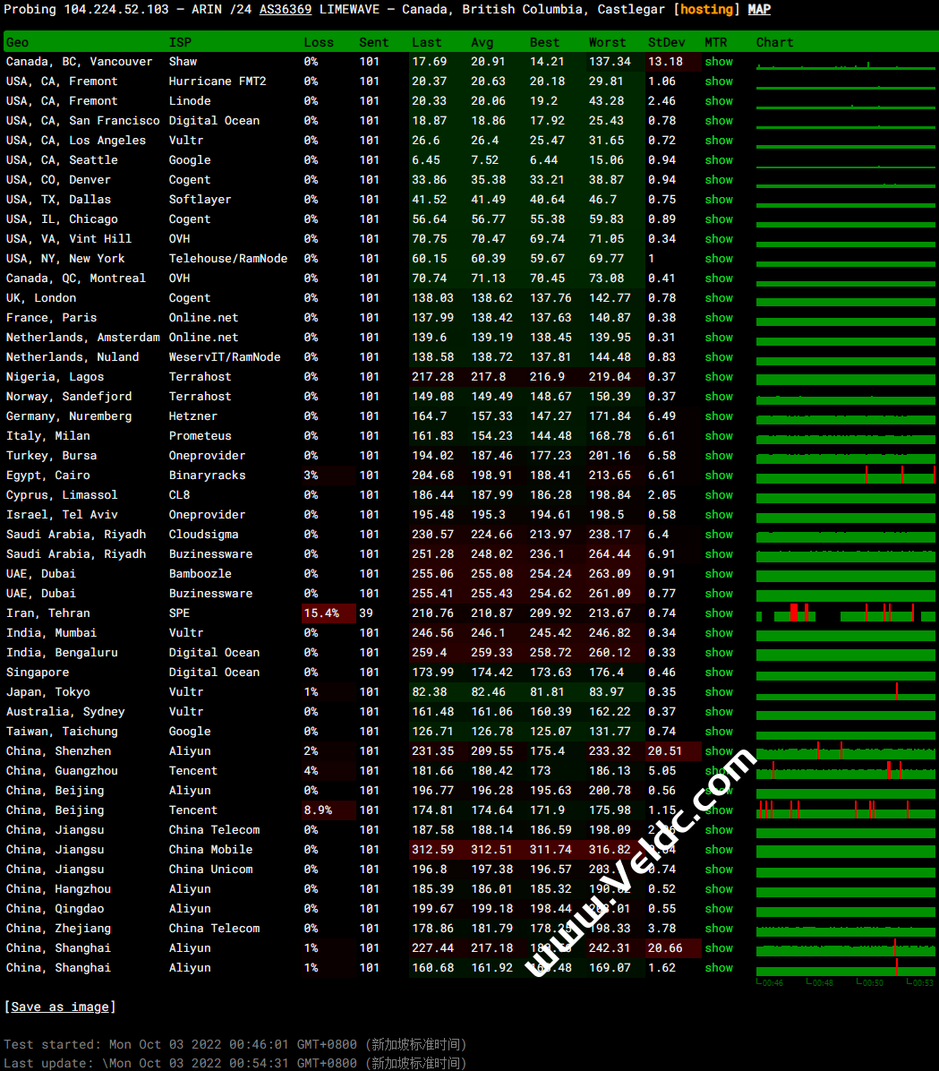 全球PING及丢包率测试: