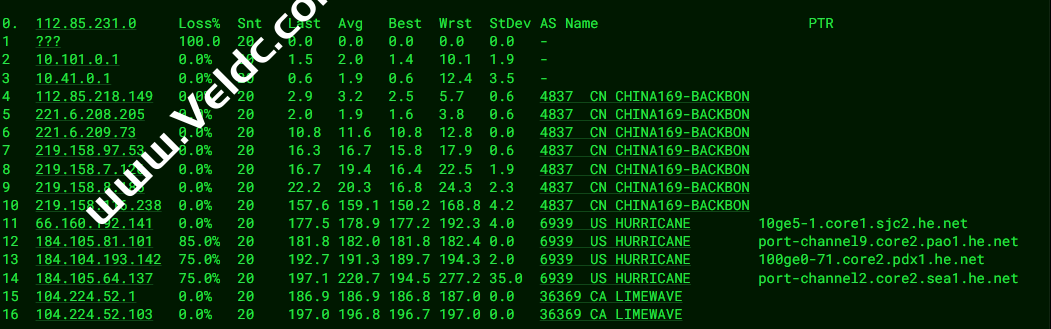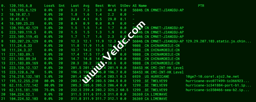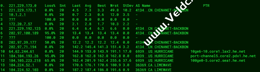 [Info] 测试路由 到 上海电信(天翼云) 中 ... traceroute to 101.227.255.45 (101.227.255.45), 30 hops max, 32 byte packets 1 xe-1-3-0.igw3.limewave.net (104.224.52.1) 0.31 ms AS36369 Canada, British Columbia, Castlegar, limewave.net 2 * 3 * 4 100ge5-1.core1.lax2.he.net (184.104.193.141) 46.83 ms AS6939 United States, California, Los Angeles, he.net 5 218.30.53.225 25.68 ms AS4134 United States, ChinaTelecom 6 202.97.58.181 159.91 ms AS4134 China, Shanghai, ChinaTelecom 7 202.97.12.185 160.31 ms AS4134 China, Shanghai, ChinaTelecom 8 202.97.57.18 157.88 ms AS4134 China, Shanghai, ChinaTelecom 9 101.95.120.81 161.32 ms AS4812 China, Shanghai, ChinaTelecom 10 * 11 * 12 * 13 * 14 * 15 * 16 * 17 * 18 * 19 * 20 * 21 * 22 * 23 * 24 * 25 * 26 * 27 * 28 * 29 * 30 * [Info] 测试路由 到 上海电信(天翼云) 完成 ! [Info] 测试路由 到 厦门电信CN2 中 ... traceroute to 117.28.254.129 (117.28.254.129), 30 hops max, 32 byte packets 1 xe-1-3-0.igw3.limewave.net (104.224.52.1) 0.40 ms AS36369 Canada, British Columbia, Castlegar, limewave.net 2 * 3 100ge11-2.core1.tyo1.he.net (184.105.213.118) 104.41 ms AS6939 Japan, Tokyo, he.net 4 100ge11-1.core1.sin1.he.net (184.105.64.253) 148.63 ms AS6939 Singapore, he.net 5 * 6 chinatelecomglobal-as4809.sgix.sg.102.16.103.in-addr.arpa (103.16.102.53) 149.61 ms * Singapore, sgix.sg 7 59.43.182.134 189.39 ms * China, Guangdong, Guangzhou, ChinaTelecom 8 * 9 59.43.130.145 193.71 ms * China, Guangdong, Guangzhou, ChinaTelecom 10 59.43.140.34 207.41 ms * China, Fujian, ChinaTelecom 11 * 12 * 13 * 14 * 15 117.28.254.129 210.98 ms AS4809 China, Fujian, Xiamen, ChinaTelecom [Info] 测试路由 到 厦门电信CN2 完成 ! [Info] 测试路由 到 浙江杭州联通 中 ... traceroute to 101.71.241.238 (101.71.241.238), 30 hops max, 32 byte packets 1 xe-1-3-0.igw3.limewave.net (104.224.52.1) 0.27 ms AS36369 Canada, British Columbia, Castlegar, limewave.net 2 * 3 100ge11-1.core1.sjc2.he.net (184.105.223.217) 18.76 ms AS6939 United States, California, San Jose, he.net 4 64.62.133.18 23.67 ms AS6939 United States, California, San Jose, he.net 5 219.158.6.5 183.53 ms AS4837 China, Shanghai, ChinaUnicom 6 219.158.6.185 179.68 ms AS4837 China, Shanghai, ChinaUnicom 7 219.158.7.133 155.85 ms AS4837 China, Shanghai, ChinaUnicom 8 219.158.115.150 162.70 ms AS4837 China, Zhejiang, Hangzhou, ChinaUnicom 9 101.71.244.94 156.99 ms AS4837 China, Zhejiang, Hangzhou, ChinaUnicom 10 * 11 * 12 * 13 * 14 * 15 * 16 * 17 * 18 * 19 * 20 * 21 * 22 * 23 * 24 * 25 * 26 * 27 * 28 * 29 * 30 * [Info] 测试路由 到 浙江杭州联通 完成 ! [Info] 测试路由 到 浙江杭州移动 中 ... traceroute to 112.17.0.106 (112.17.0.106), 30 hops max, 32 byte packets 1 xe-1-3-0.igw3.limewave.net (104.224.52.1) 0.31 ms AS36369 Canada, British Columbia, Castlegar, limewave.net 2 * 3 100ge11-1.core1.sjc2.he.net (184.105.223.217) 18.84 ms AS6939 United States, California, San Jose, he.net 4 216.218.132.102 20.76 ms AS6939 United States, California, Fremont, he.net 5 223.120.6.69 19.14 ms AS58453 United States, California, San Jose, ChinaMobile 6 223.120.12.138 204.18 ms AS58453 China, Shanghai, ChinaMobile 7 221.183.89.170 198.39 ms AS9808 China, Shanghai, ChinaMobile 8 221.183.89.33 198.63 ms AS9808 China, Shanghai, ChinaMobile 9 221.183.89.10 206.94 ms AS9808 China, Shanghai, ChinaMobile 10 221.183.40.70 219.14 ms AS9808 China, Zhejiang, Hangzhou, ChinaMobile 11 * 12 * 13 * 14 * 15 * 16 * 17 * 18 * 19 * 20 * 21 * 22 * 23 * 24 * 25 * 26 * 27 * 28 * 29 * 30 * [Info] 测试路由 到 浙江杭州移动 完成 ! [Info] 测试路由 到 北京教育网 中 ... traceroute to 202.205.6.30 (202.205.6.30), 30 hops max, 32 byte packets 1 xe-1-3-0.igw3.limewave.net (104.224.52.1) 0.23 ms AS36369 Canada, British Columbia, Castlegar, limewave.net 2 * 3 100ge11-2.core1.tyo1.he.net (184.105.213.118) 104.14 ms AS6939 Japan, Tokyo, he.net 4 * 5 cernetedu1-lacp-10g.hkix.net (123.255.91.118) 160.18 ms * China, Hong Kong, hkix.net 6 101.4.114.181 174.87 ms AS4538 China, Beijing, CHINAEDU 7 * 8 * 9 101.4.118.213 175.22 ms AS4538 China, Beijing, CHINAEDU 10 * 11 219.224.102.230 178.66 ms AS4538 China, Beijing, CHINAEDU 12 * 13 * 14 * 15 * 16 * 17 * 18 * 19 * 20 * 21 101.4.130.53 176.52 ms AS4538 China, Beijing, CHINAEDU 22 * 23 * 24 101.4.130.54 176.59 ms AS4538 China, Beijing, CHINAEDU 25 * 26 * 27 * 28 * 29 * 30 * [Info] 测试路由 到 北京教育网 完成 ! [Info] 四网路由快速测试 已完成 !