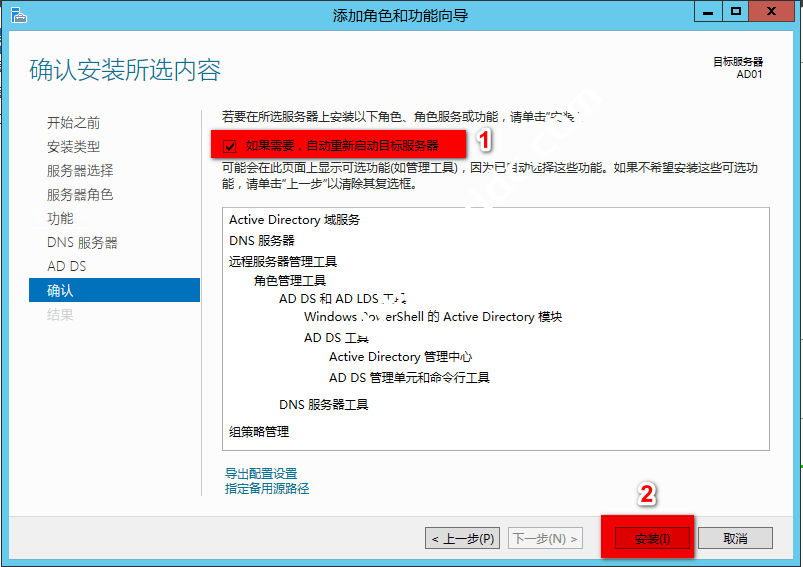 确认配置这里将“如果需要,自动重新启动目标服务器”打勾,点击“安装”