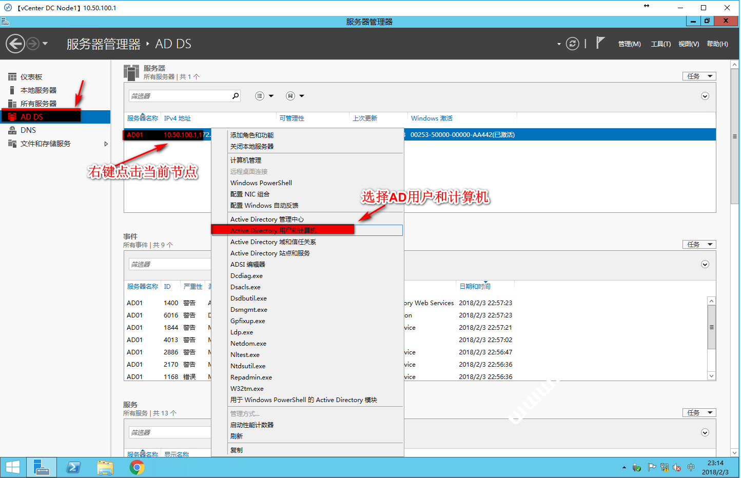 回到服务器管理器界面,然后选择”AD DS“,接着右键选择”AD01“这个节点,在弹出的界面选择“Active Directory 用户和计算机”