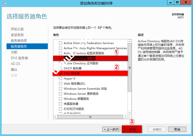 选中“Active Directory域服务”和”DNS服务器”后,点击“下一步”