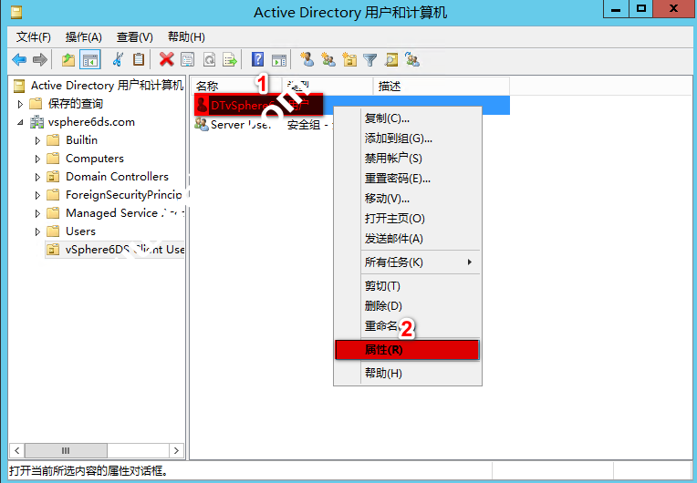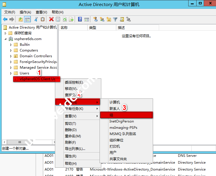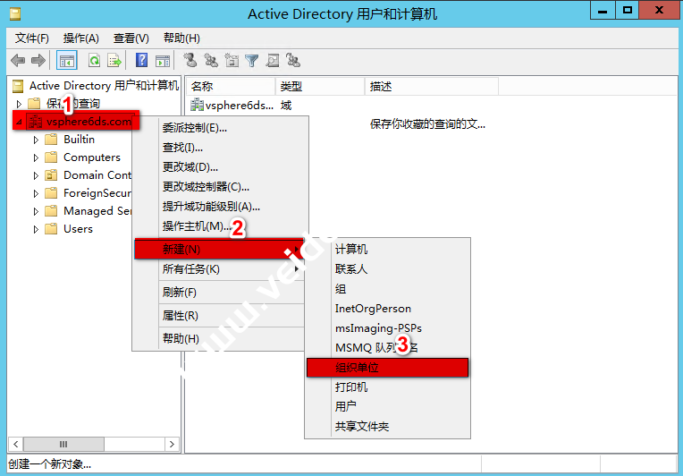 右击“vsphere6ds.com”域 –> “新建” –> “组织单位”,也可以单击工具栏中的“新建组织单位”按钮进行新建组织单位