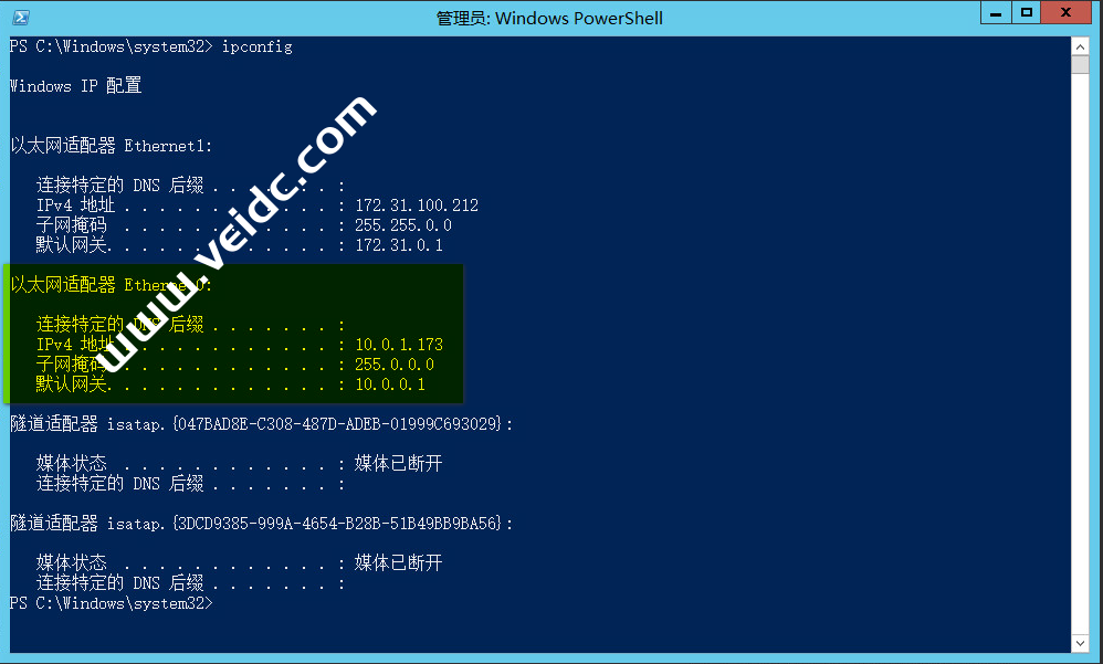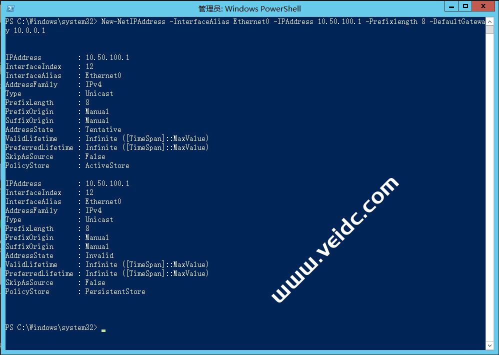 ipconfig #或者使用命令 Get-NetIPConfiguration 获取IP信息New-NetIPAddress -InterfaceAlias Ethernet0 -IPAddress 10.50.100.1 -Prefixlength8 -DefaultGateway 10.0.0.1 |
