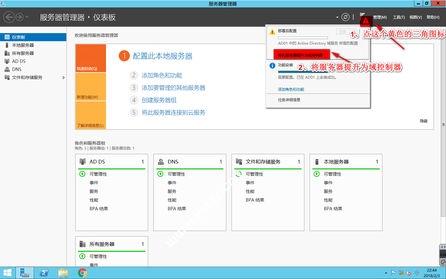 回到该服务器的“服务器管理器”,点击“通知”-“将此服务器提升为域控制器”