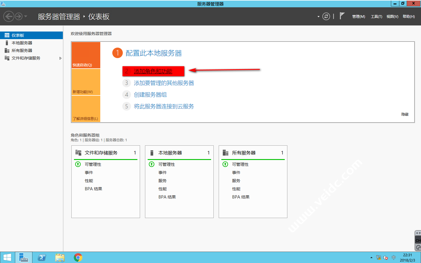 在需要添加为域控制器的服务器上打开“服务器管理器”,点击“添加角色和功能”
