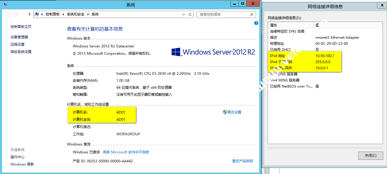 Vmware的虚拟机环境搭建了两台windowsserver 2012