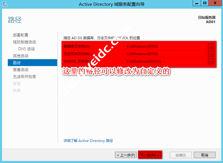 指定AD DS数据库、日志文件和SYSVOL的位置都放置D盘,点击“下一步”