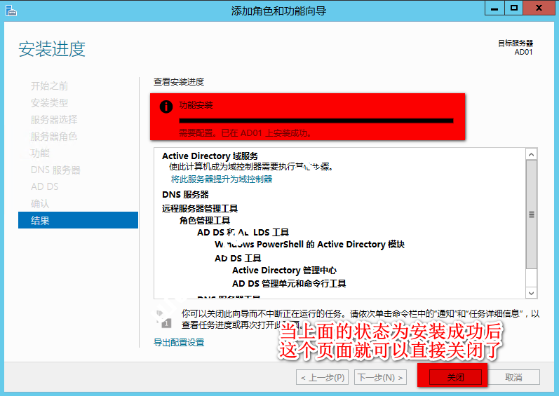 AD域服务角色安装完成,点“关闭”,当然也可以点击“将此服务器提升为域控制器”来添加域控制器,这里不这么做