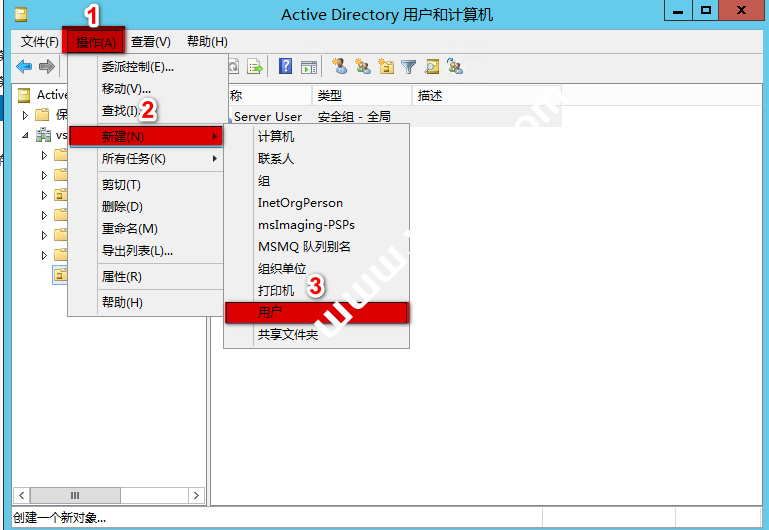右击“Client User”组织单位-“新建”-“用户”,也可以单击工具栏中的“新建用户”按钮进行新建用户