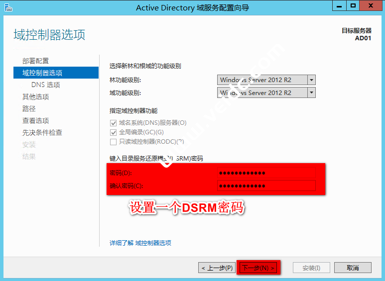 设置一个DSRM密码,点击“确定”