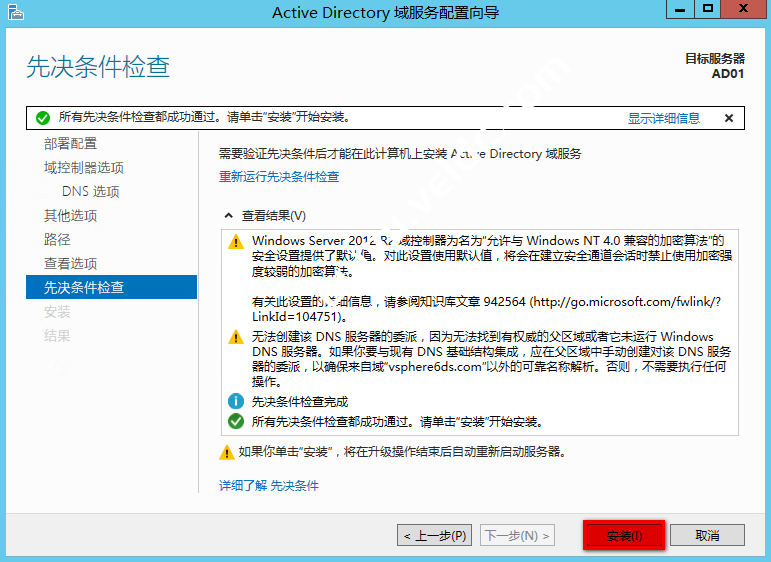 先决条件检查已通过,点击“安装”