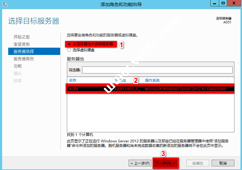 服务器选择“从服务器池中选择服务器”,选中“AD01”,点击“下一步”