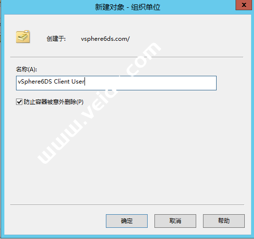 设置组织单位名称,把“防止容器被意外删除”打勾,点“确定”,这样组织单位就新建完成了