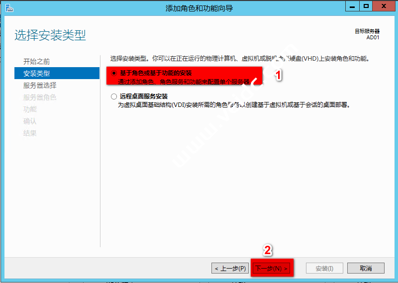安装类型选择“基于角色或基于功能的安装”,点击“下一步”